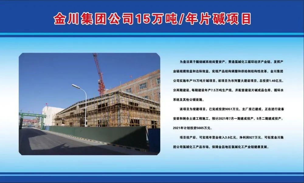 为盘活离子膜烧碱系统闲置资产,贯通氯碱化工循环经济产业链,发挥产业链规模效益和边际效益,实现产品结构调整和供给侧结构性改革,金川集团公司实施15万吨/年片碱项目。该项目为市列重大建设项目,分两期建设,一期7.5万吨/年,二期7.5万吨/年,配套建设片碱成品仓库、循环水系统及其他公辅设施,项目总投资1.5亿元。