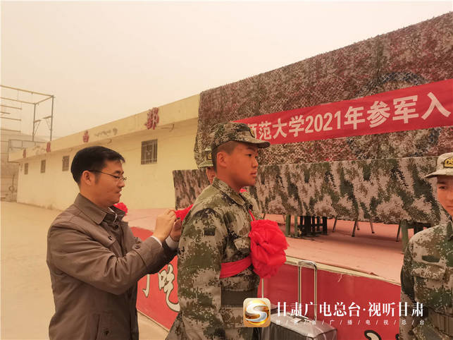 西北师大党委学生工作部、教育学院、外国语学院和数学与统计学院等单位、学院负责人前往安宁区人武部应征入伍青年役前训练基地,欢送2021年春季从学校应征入伍的大学生新兵,为他们佩戴红花、赠送纪念品,希望同学们努力把个人理想和抱负融入强军梦,强化责任担当,扎根军营,在部队安心服役,学习科学文化知识,熟练掌握军事本领,用青春年华报效党、人民和祖国。