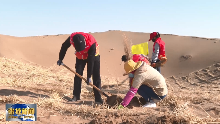 在临泽县平川镇义务压沙造林现场,一个个头戴小红帽,身穿红色或者白色马夹的身影格外引人注目,他们是张掖市临泽县新时代文明实践所组织的志愿者们,日前,他们专程来为戈壁荒漠增添一片新绿。
