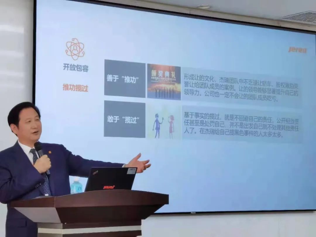 在杰瑞集团公司,董事局主席孙伟杰讲授了杰瑞的企业文化,人力资源部总监王磊讲授了杰瑞企业文化落地与干部培养实践。