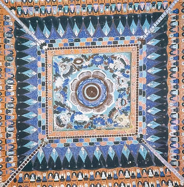 这幅图乍眼一看就像爱马仕的丝巾一样规则又繁密,但仔细看,这朵盛开的大莲花四周各绘制一朵小莲花和摩尼宝珠,四角画化生童子。古代画师巧妙地以缠枝将小莲花、宝珠、化生童子串联成一个大花环。花环与大莲花之间涂淡绿色,以表现清雅的莲池碧水。藻井以赭红色为边框,以黑、蓝、红、绿四色反覆连结成外围边饰,蓝、绿色为底。其丰富和寓意,可比那丝巾考究有趣多了~