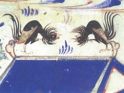 游戏中人们把两只雄鸡放入场中,使之互相啄斗,胜者器宇轩昂,败者垂头丧气。