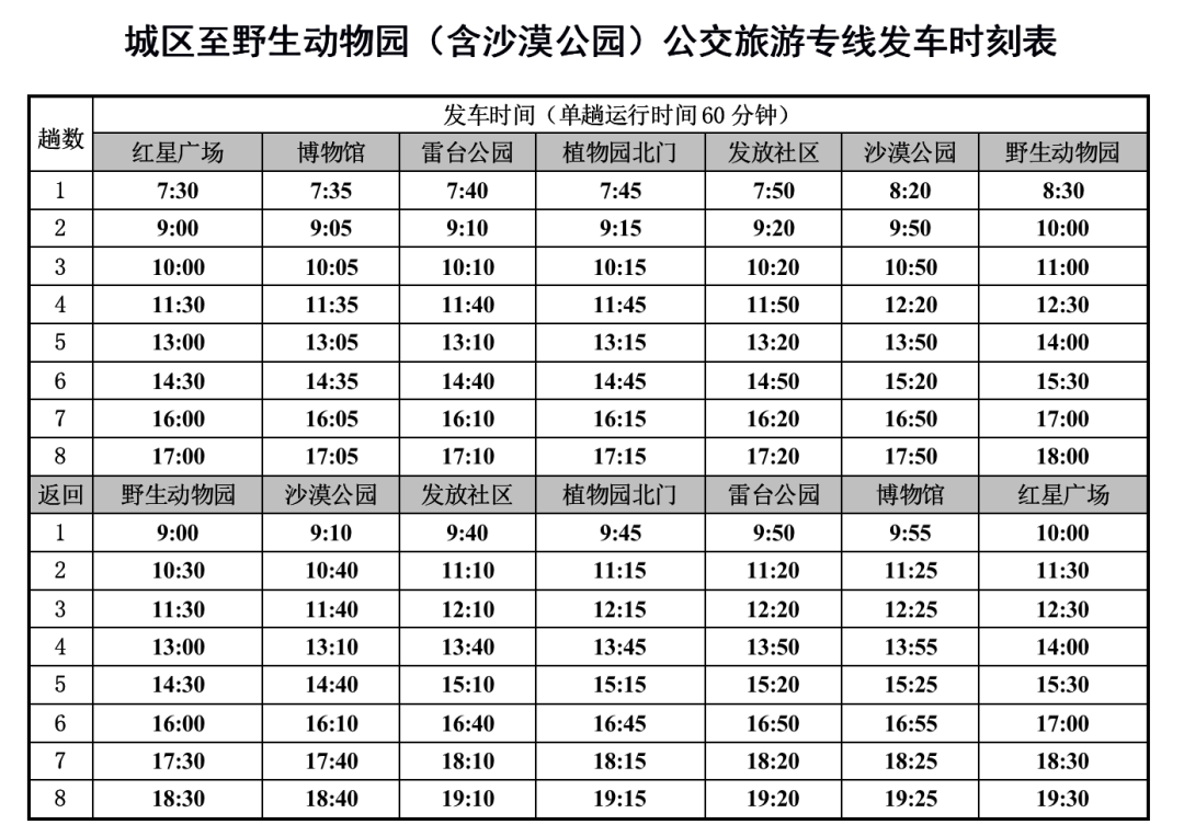 红星广场--博物馆--雷台公园--植物园北门--天颐桥--发放社区--东城嘉园--沙漠公园--野生动物园往返运营。