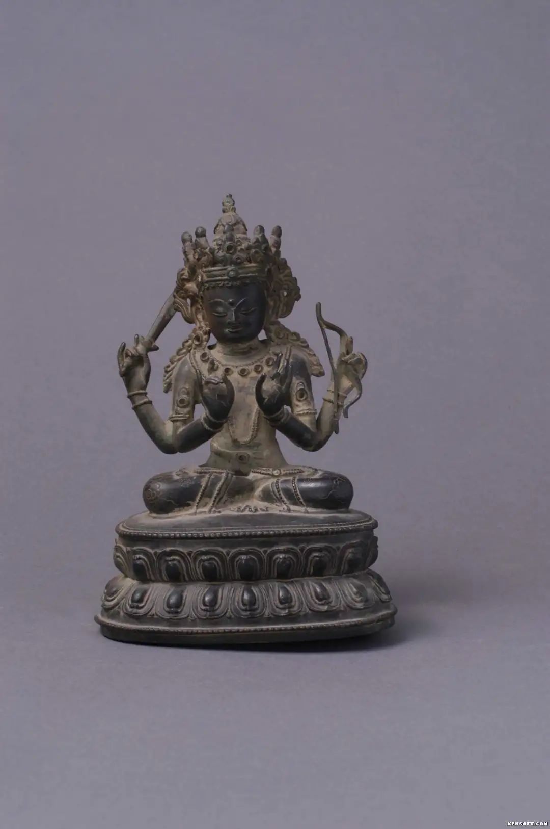 今天向大家分享的是清四臂观音铜像,黄铜质,通高15.5厘米,底座长10.7厘米,宽7厘米。观音头戴花冠,两耳垂肩,佩耳珰。两条余发披于肩上。眉间有白毫。佩戴璎珞。四臂,后两臂一手执剑,一手执弓;前两臂两手作说法印。四臂戴臂钏、手镯。裸上身,下身着紧身薄透衣裙,裙上有莲花,身上嵌宝珠。结跏趺坐于仰覆莲座上。保存完整,为国家二级文物,现馆藏于武威市博物馆。