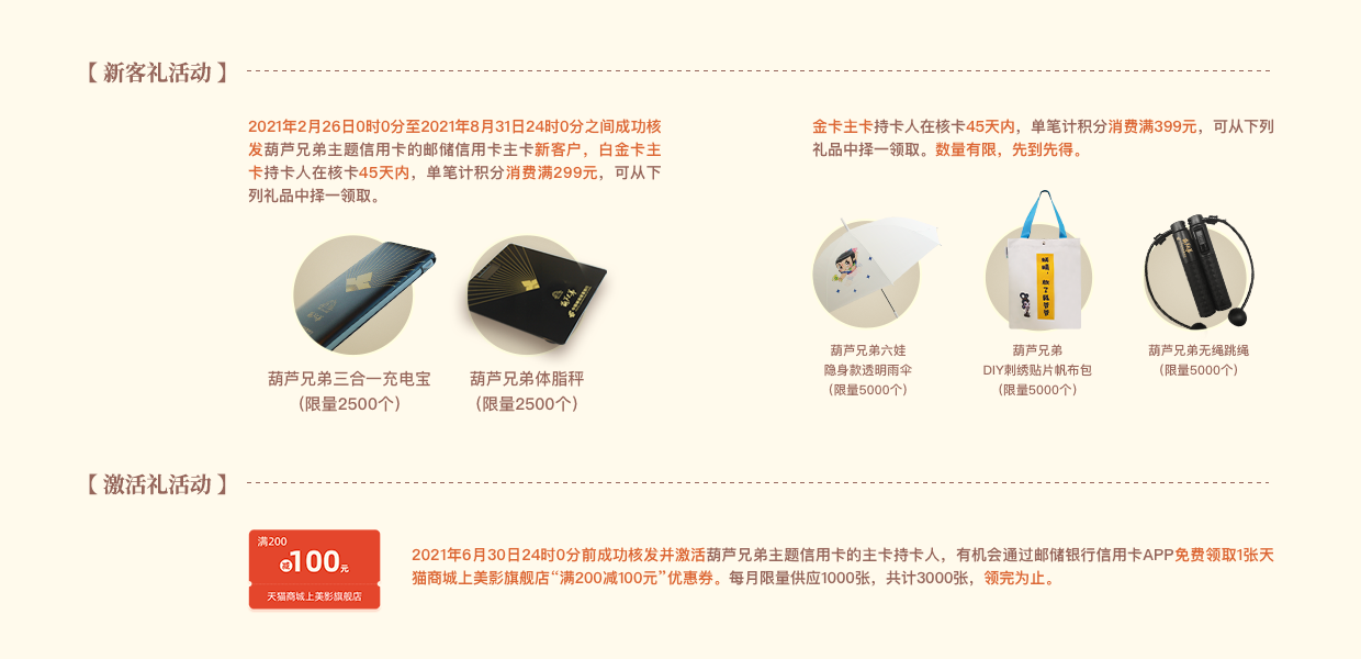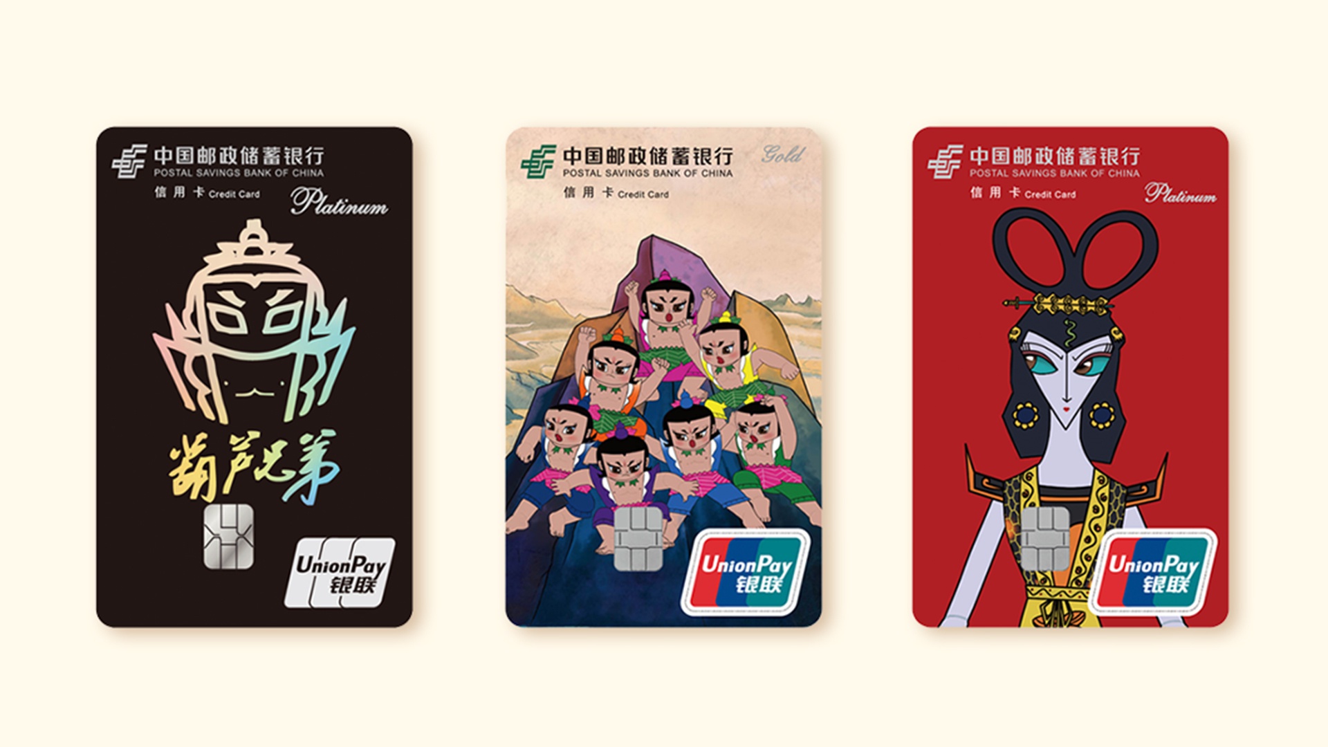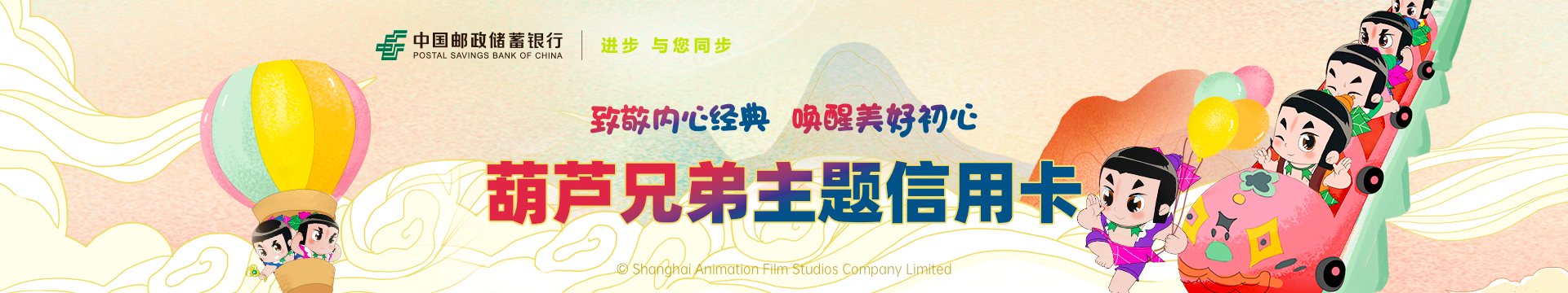致敬内心经典,唤醒美好初心,中国邮政储蓄银行葫芦兄弟主题信用卡新卡面重磅上线。精巧葫芦卡、炫酷幻彩卡、百变异形卡,结合先进浮雕、镭射等工艺,立体有层次,独特有质感,让儿时经典与时尚潮流碰出火花。更有海量精美好礼等你来领取!