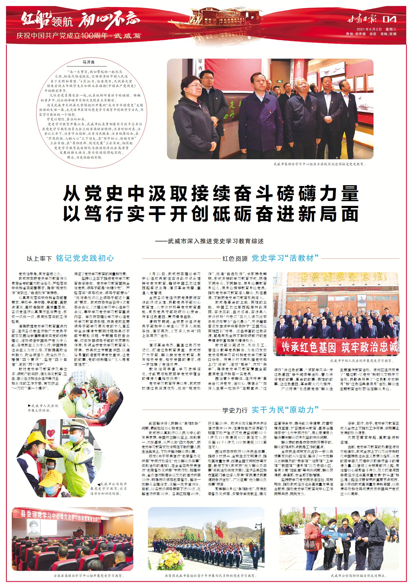 当前,党史学习教育的热潮在凉州大地涌动,武威全市上下以习近平新时代中国特色社会主义思想为指引,从党的百年非凡历程中汲取接续奋斗的精神力量,以信仰之光照亮前行之路,用如磐初心凝聚奋斗伟力,努力打造河西走廊经济社会高质量发展“桥头堡”和丝绸之路经济带甘肃段重要节点城市,奋力开创武威高质量发展新局面,以实绩实效和优异成绩庆祝中国共产党成立100周年。