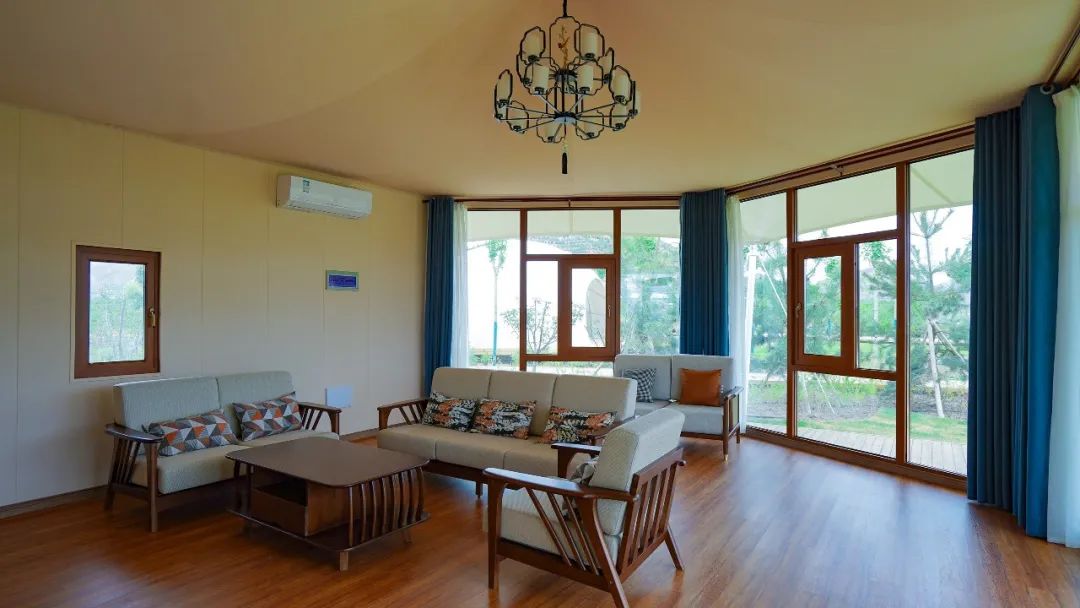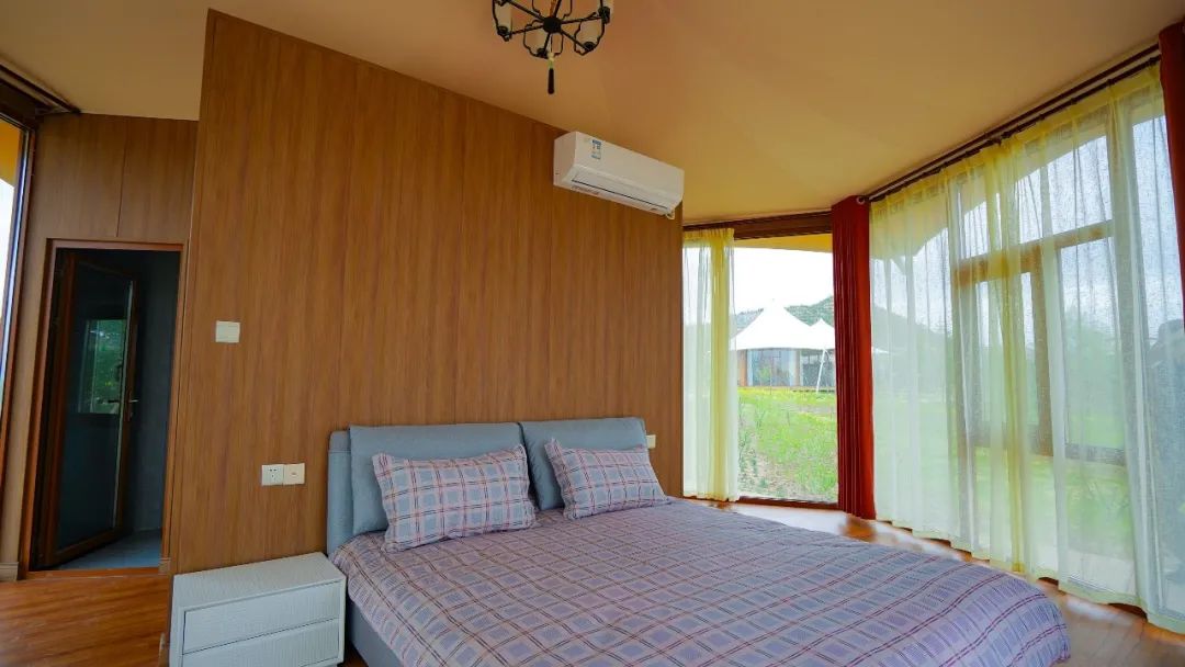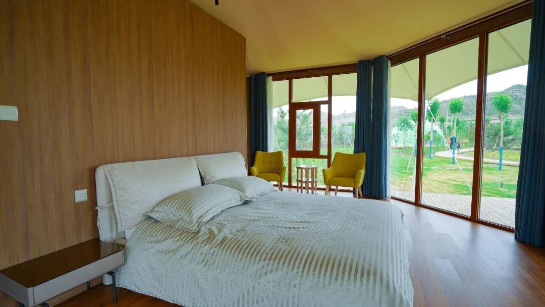从天空俯瞰7座星空木屋呈北斗七星的造型,7座木屋各具特色,有的是挑高设计,带一个室外露台;有的是卡通造型,像可爱的蜗牛和海螺;有的是中式装修风格,古朴庄重;有的是田园家居设计,休闲恬淡。木屋内家具、卫浴一应俱全,四周为落地玻璃窗,拉开窗帘就与自然融为一体,白天田园风光尽收眼底,夜晚与月亮星空作伴,让游客全方位体验惬意的田园生活。