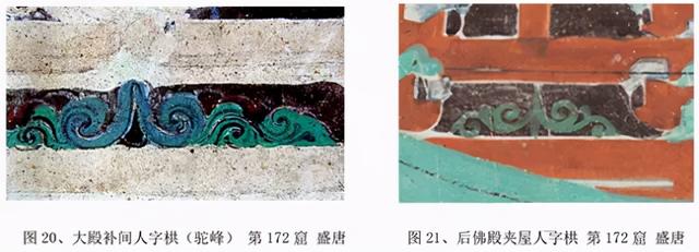 初唐出现的双旋卷草栱的补间形式,仍然在沿用,不同的是双旋卷草栱上承托的柱头枋上已有出跳。敦煌壁画中自初唐出现的双旋卷草形栱由人字栱演化并向驼峰转变,可以清楚的看到它的发展轨迹,时代越晚,卷草中间的弧形越大(图20、21、22、23)。“人”字栱的痕迹消失殆尽。