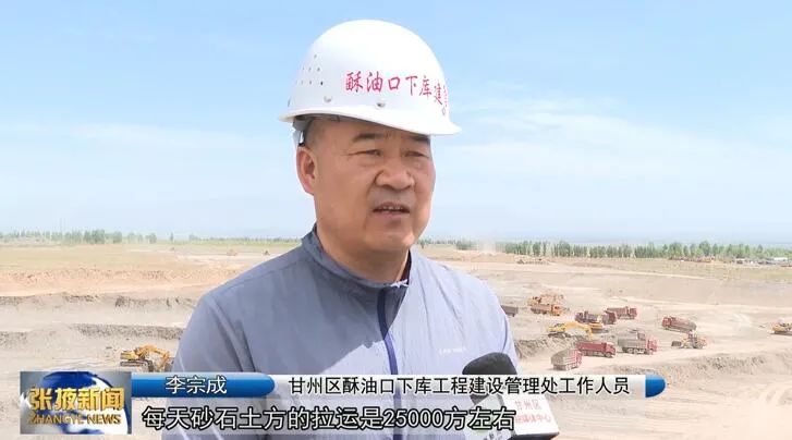 甘州区酥油口下库工程建设管理处工作人员 李宗成:“库区完成南坝和东坝的碾压设计高程,每天砂石土方的拉运是25000方左右,输水涵洞已完成混凝土浇灌380米。”