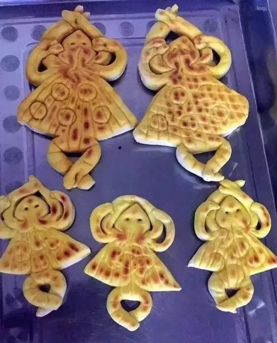 “我们把鼓角拿在手里,总不舍得先吃,要拿到门口和小伙伴比较一番,然后一起商量先从哪个部位下口咬,几乎每次头都是舍不得先吃掉的,于是又细又长的胳膊便成了首选。一口咬下脆香的‘胳膊’,口齿生香,我们舍不得马上咽下去,要在嘴里嚼好久……”
