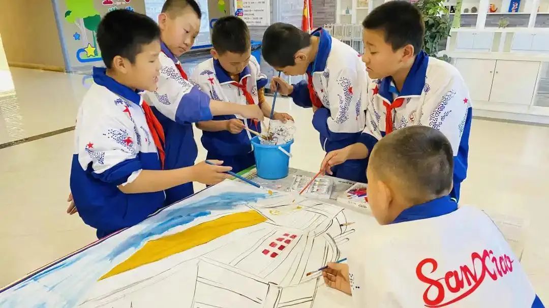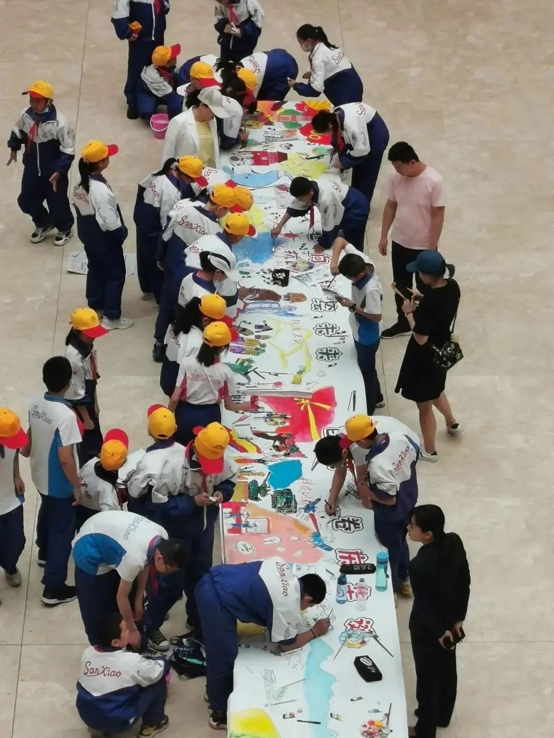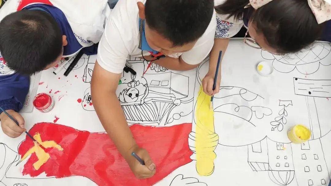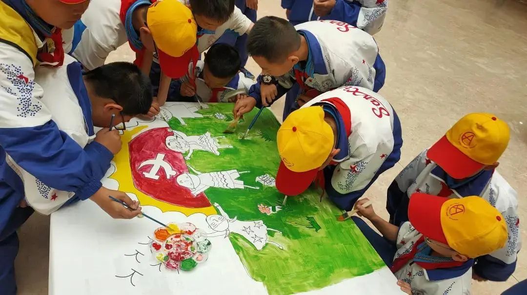 小小画家们或蹲、或跪、或趴在画卷上,以画传情、以画抒志。时间在笔尖悄然流淌,学生们将自己对党的感恩之情、对祖国的美好期待都变成一个个鲜活的场景,在画卷上一一呈现。