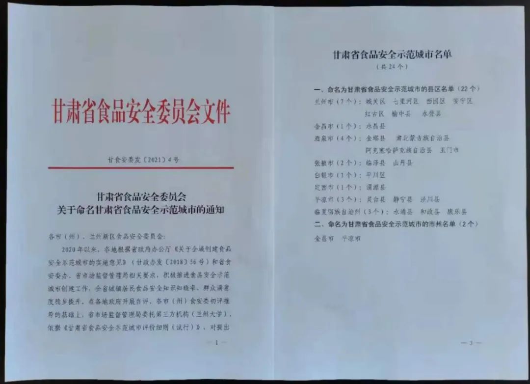 近日,省食品安全委员会公布了被命名为“甘肃省食品安全示范城市”的2个市州和22个县区名单,金昌市、永昌县位列其中。