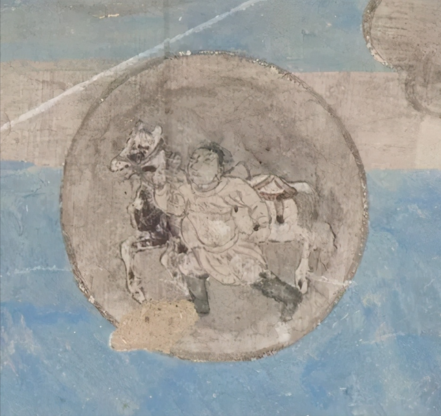 炽盛光佛位于画面的中央,结跏趺坐于车内,车头部分残损,据专家考证应为牛车,佛右手食指顶金轮,左手作禅定印,九曜围绕前后。