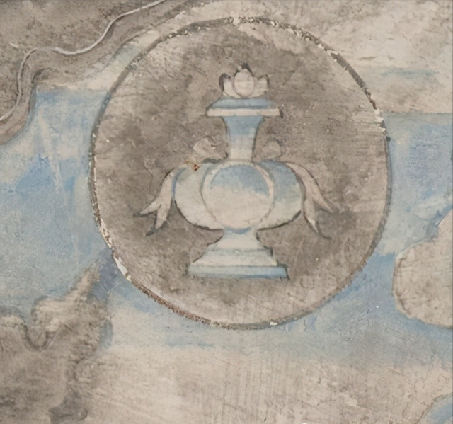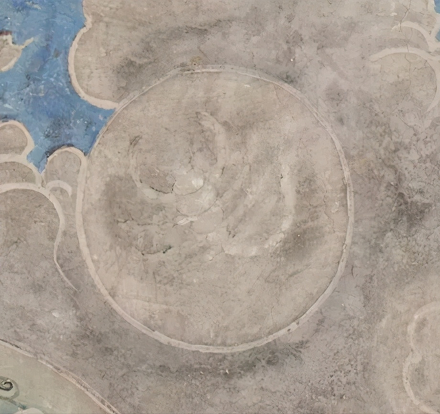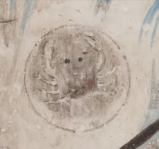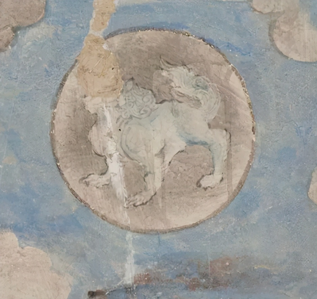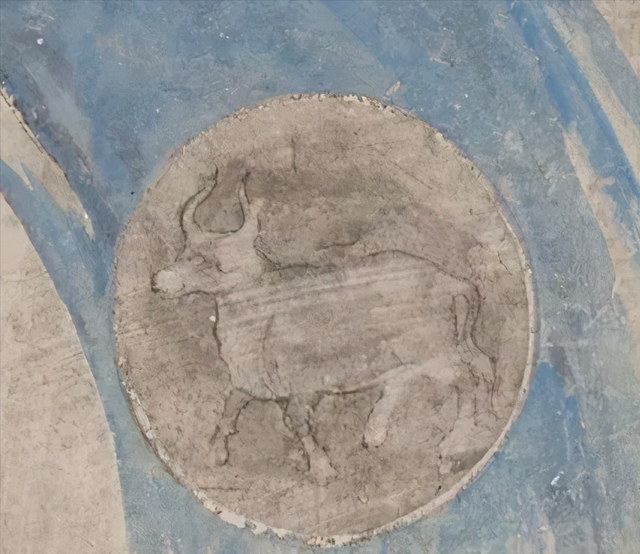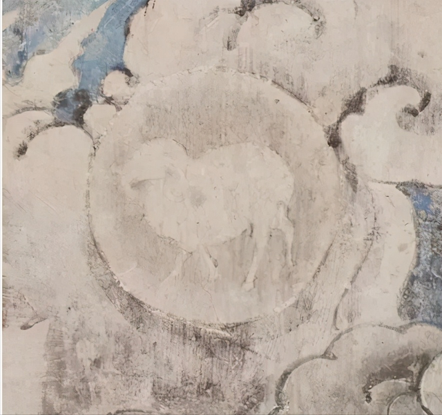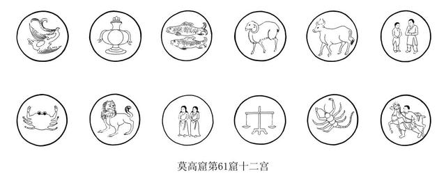 炽盛光佛图上部绘制黄道十二宫,每一宫以圆形表示,圆内画有该宫形象,南壁现存九座,由东至西分别为:金牛宫、室女宫、白羊宫、摩羯宫、天秤宫、双子宫、巨蟹宫、天蝎宫、双鱼宫;北壁现存九座,从西至东为:狮子宫、宝瓶宫、金牛宫、人马宫、摩羯宫、室女宫、天秤宫、天蝎宫、白羊宫。