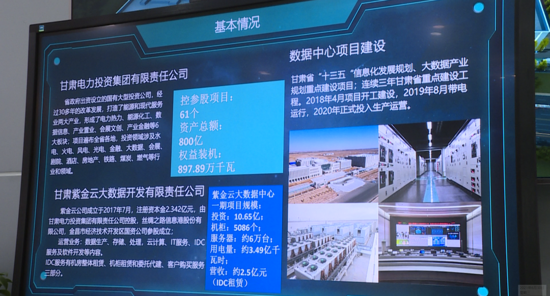 由甘肃紫金云公司承建和运营的金昌紫金云大数据产业园区数据中心项目,计划分三期建设,总投资约50亿元,其中规划设计安装5万个机柜,总用电量23亿千瓦时。截至目前,一期的第一个阶段1.1期不仅具备2543个机柜租用服务能力,还取得了国家工信部发放的数据中心电信业务经营许可证,是甘肃省首家通过A级机房认证的数据中心。