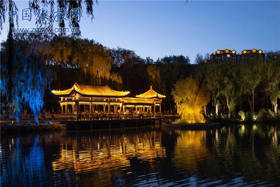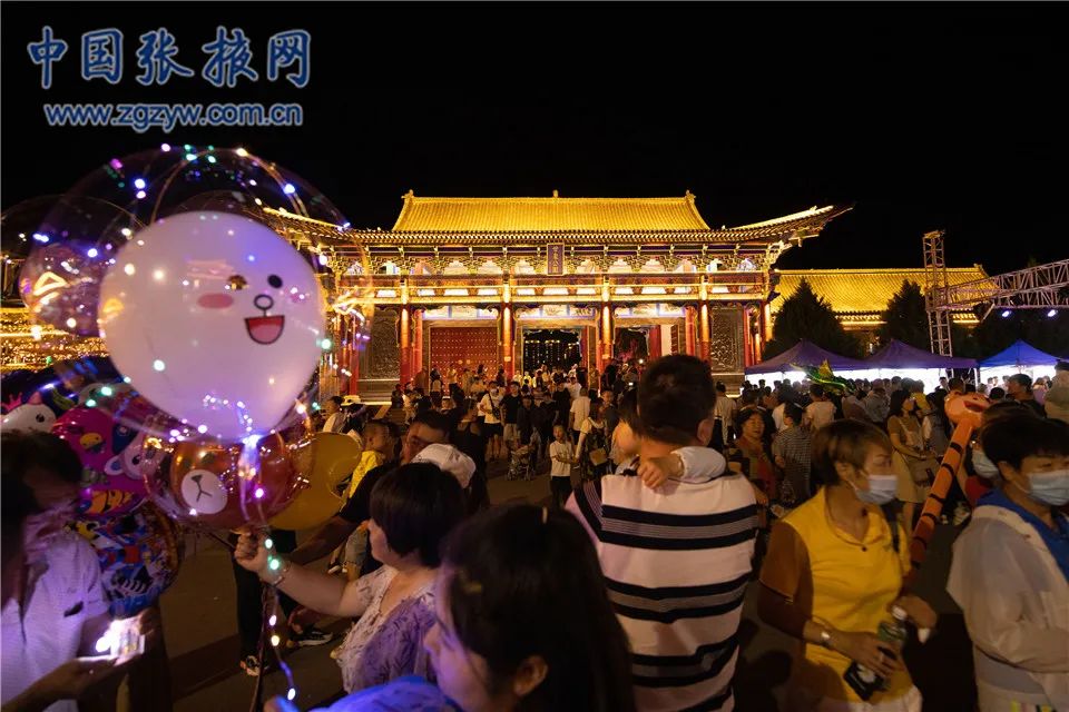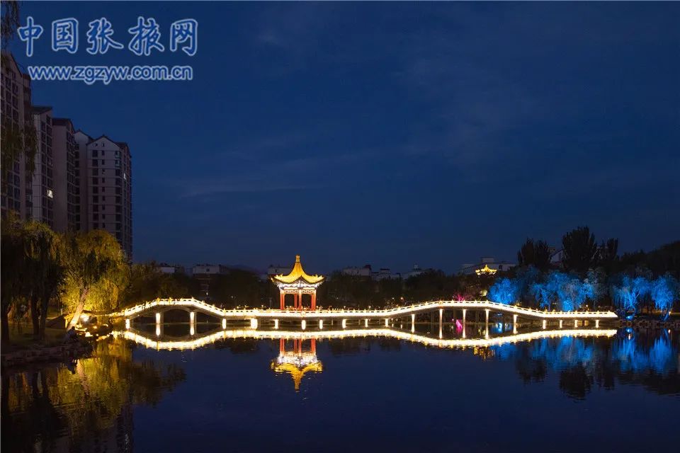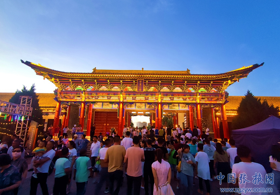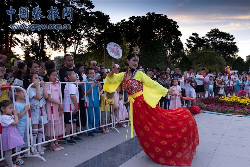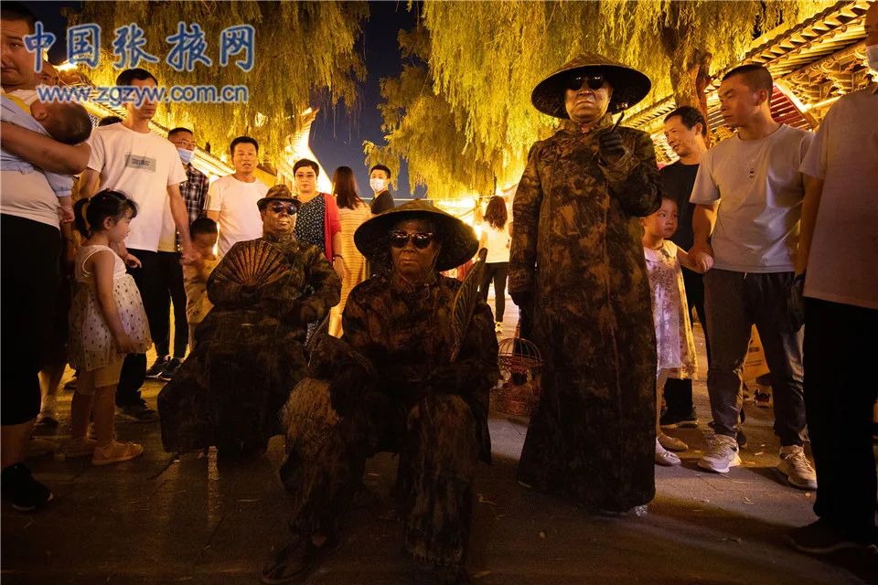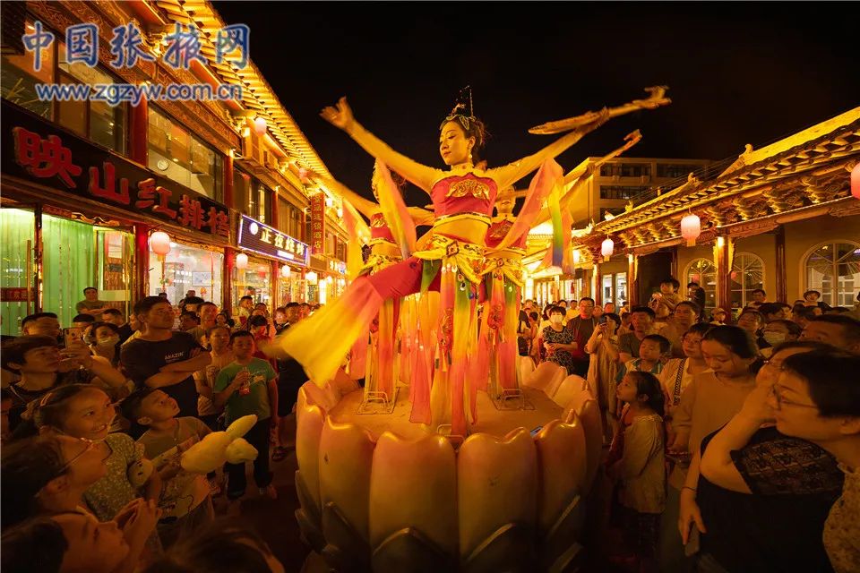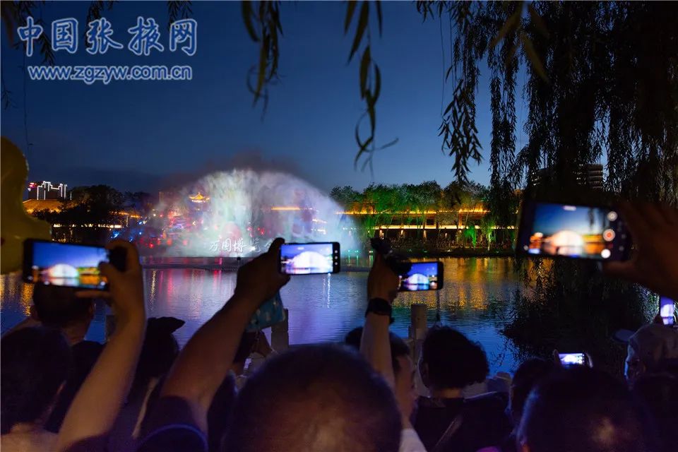 这里入夜文化惠民及非物质文化遗产展演持续不断,网红“飞天舞者”“铜人”“不倒翁”等惊艳亮相,吸引了众多游人流连忘返。 甘泉公园内3D灯光秀和夏夜的水幕电影让甘州的夜空璀璨夺目。(特约摄影师 吴玮/摄 本网记者 邢琪琦)