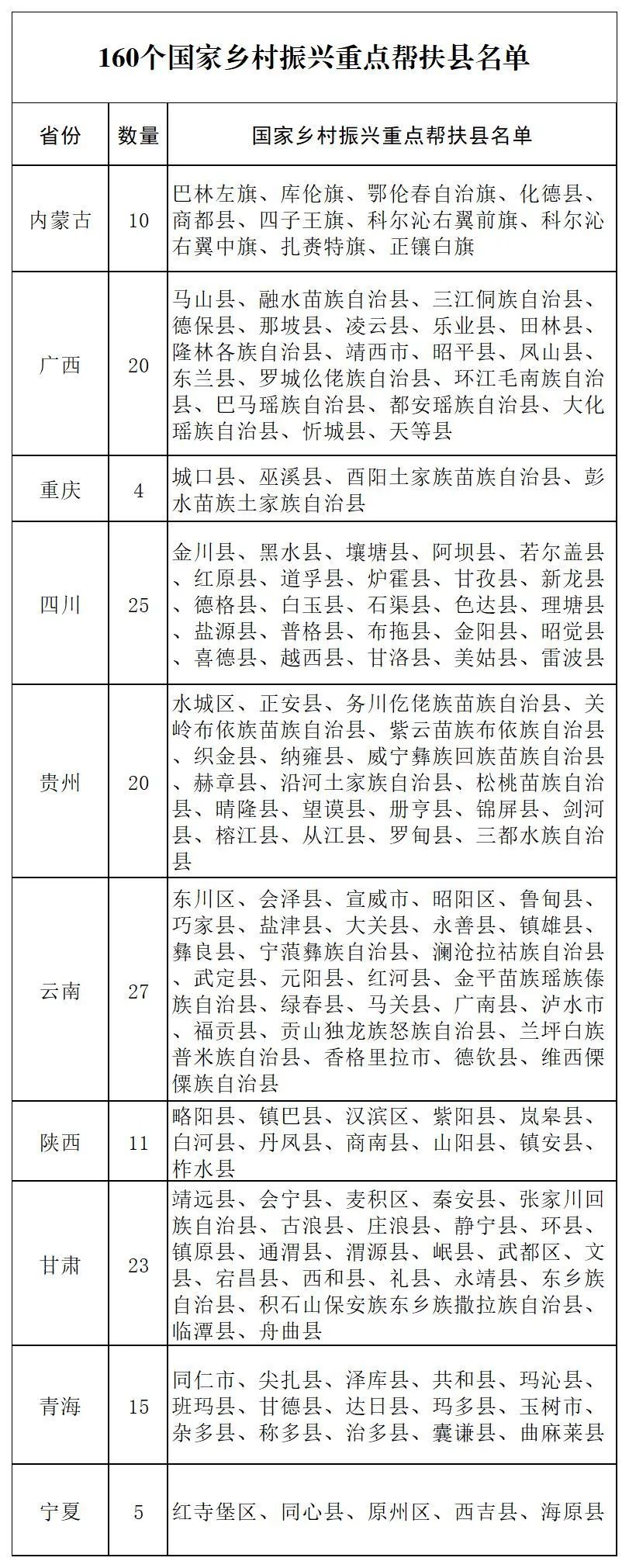 根据党的十九届五中全会精神、中央农村工作会议精神和《中共中央、国务院关于实现巩固拓展脱贫攻坚成果同乡村振兴有效衔接的意见》安排部署,中共中央办公厅、国务院办公厅印发有关文件,西部10省区市综合考虑人均地区生产总值、人均一般公共预算收入、农民人均可支配收入等指标,统筹考虑脱贫摘帽时序、返贫风险等因素,结合各地实际,确定了160个国家乡村振兴重点帮扶县,经中央农村工作领导小组批准同意,现予以公布。