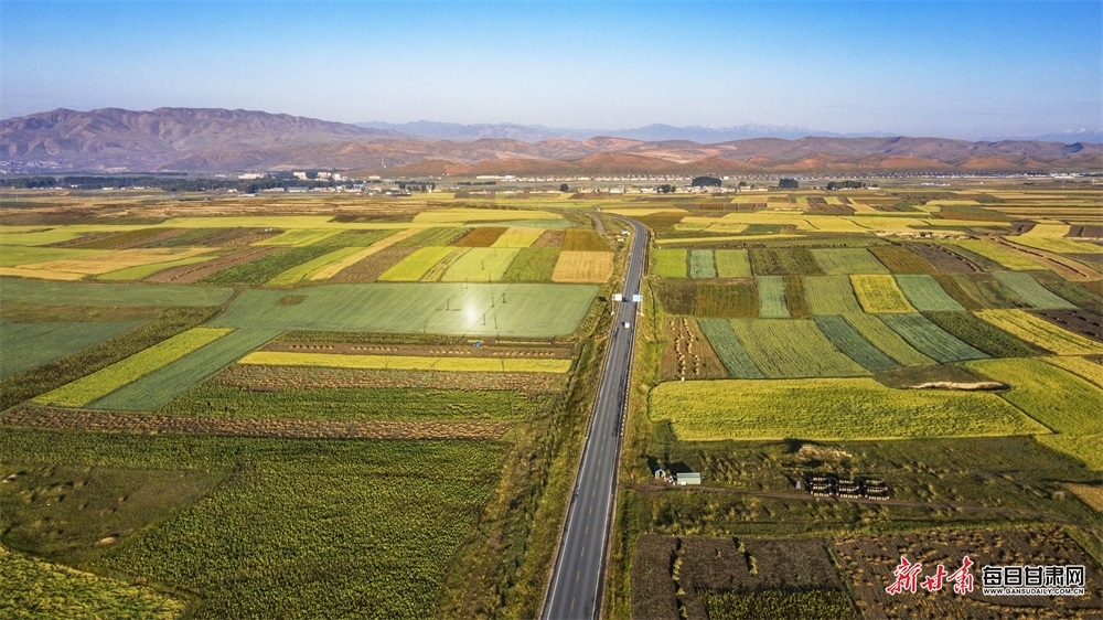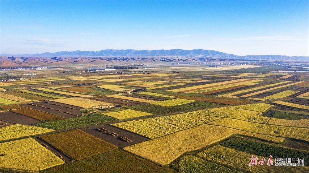金秋时节,天祝县松山镇秋意浓浓。俯瞰大地,浩渺的田野颜色各不相同,色彩斑斓,宛如上帝打翻的巨大调色盘。