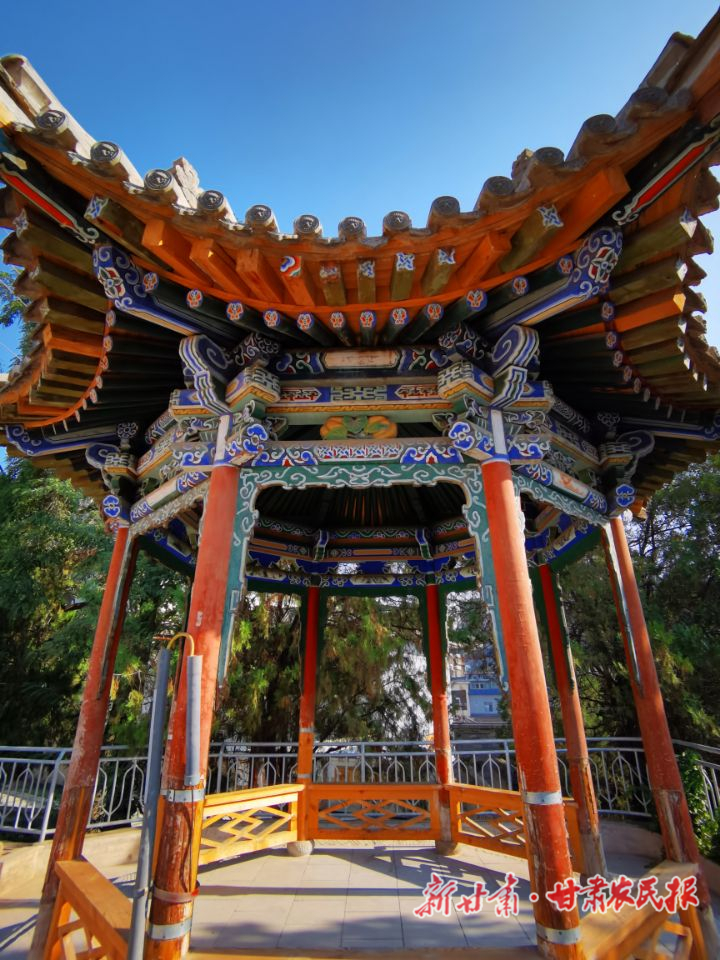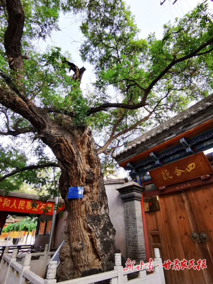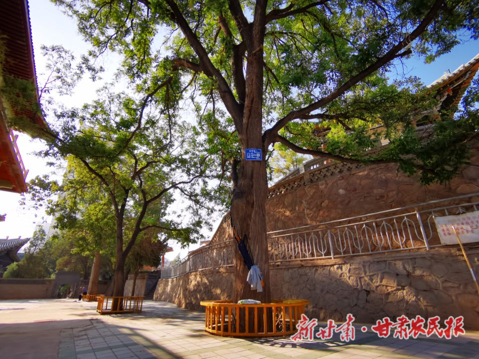 走进金天观大门,曾经金碧辉煌的“金天观”三个大字已经被“兰州市工人文化宫”匾额所取代。穿过秀美玲珑的魁星阁,西面有一座古色古香的四合院,门口一株唐槐荫蔽四周,据记载已经有1300多年的树龄。再往西走,玉皇阁青砖黛瓦、雕梁画栋、飞檐翘角、庄重俨然,院内墙下围了游客五六人,正在细心辨认碑刻上的字迹。