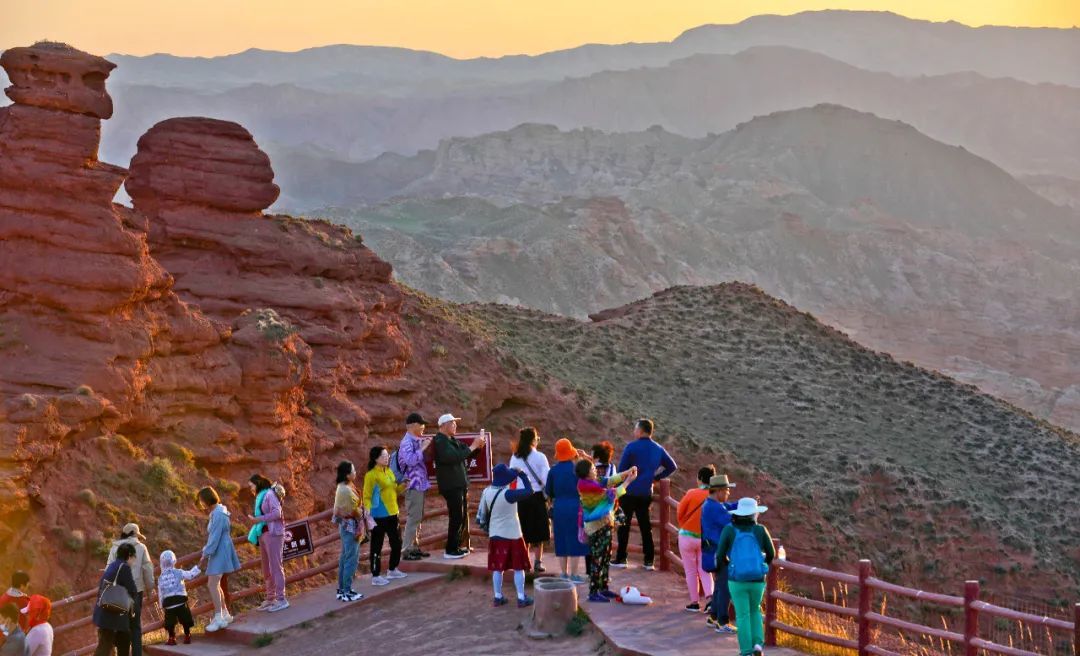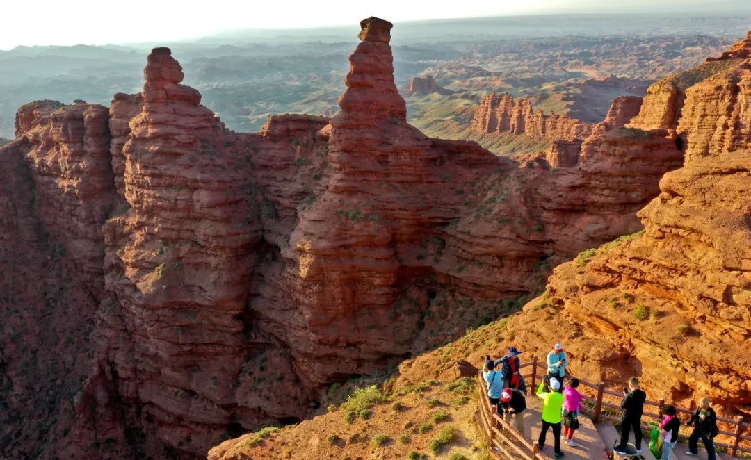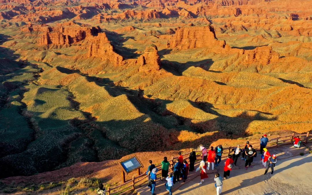 2021年9月20日,游客在张掖市甘州区平山湖大峡谷观赏美景。