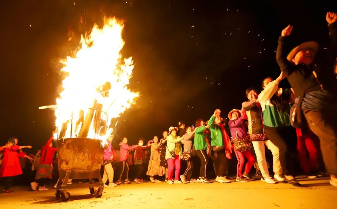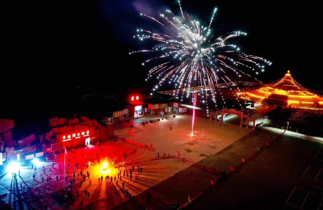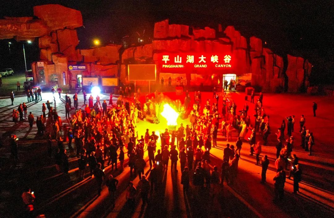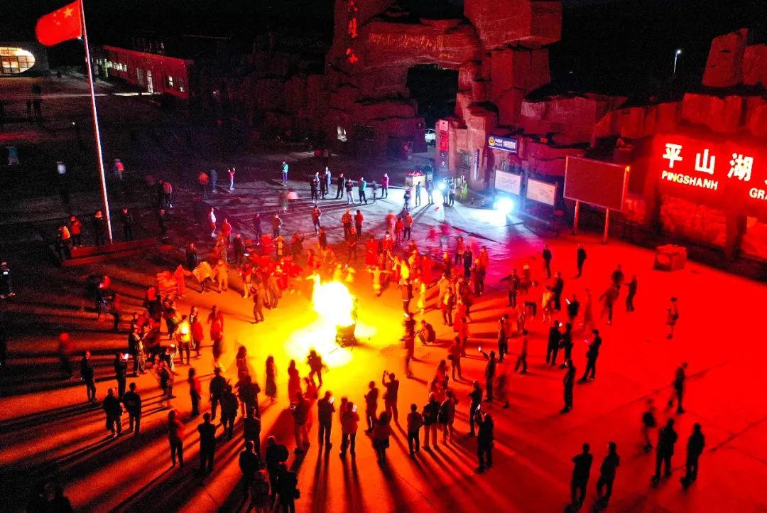 2021年9月20日,游客在张掖市甘州区平山湖大峡谷景区点燃篝火、跳起锅庄,在欢声笑语中庆祝中秋节。