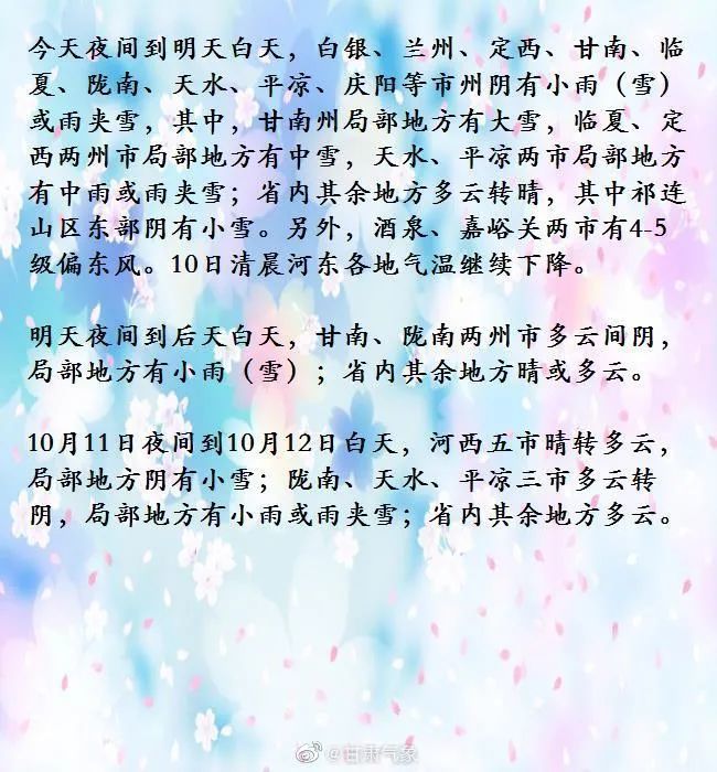 10月8日夜间到10月9日白天,定西、临夏、甘南、陇南、天水、平凉、庆阳等市州多云转阴有小雨(雪)或雨夹雪,局部地方有中雨,其中甘南州局部地方有中雪;张掖、金昌、武威、兰州、白银等市多云转阴有小雨(雪);省内其余地方阴转多云。另外河西五市及白银、平凉、庆阳三市有5-6级西北风,阵风可达7-8级,受冷空气影响全省各地气温下降6℃-8℃。