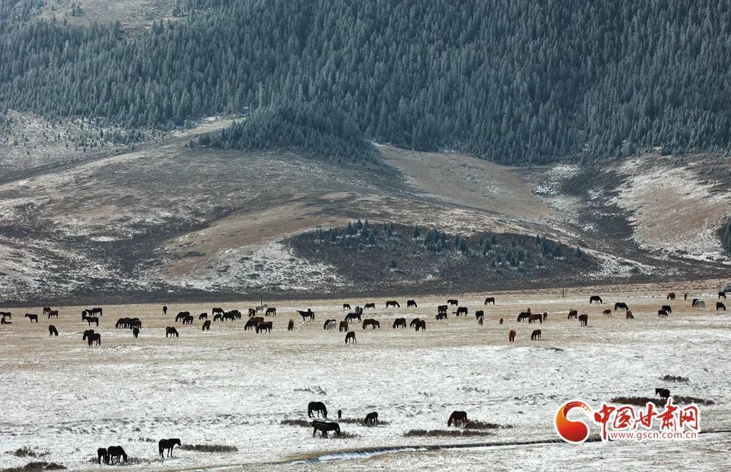 10月9日,受冷空气影响,位于甘肃省河西走廊中部的山丹马场迎来降雪天气,马群在雪原上奔跑觅食,一派北国风光。