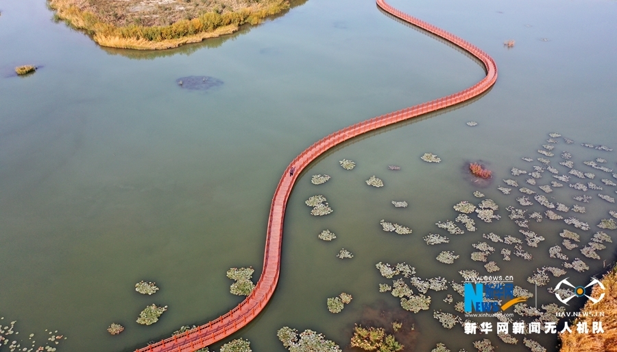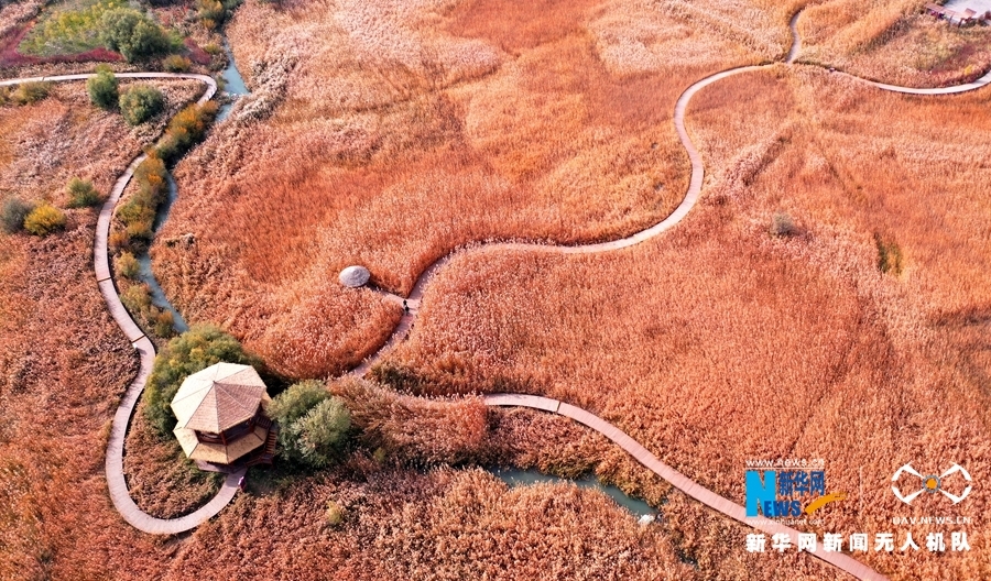这是10月12日航拍的甘肃省张掖国家湿地公园芦苇荡 新华网发(杨永伟 摄)