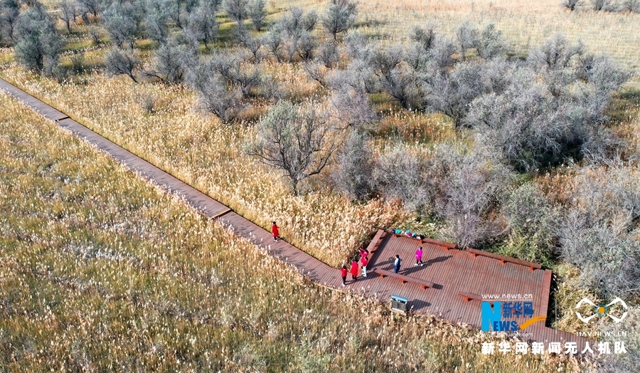 金秋时节,张掖国家湿地公园秋高气爽,苇花飘香,景色怡人,吸引游客打卡游览。