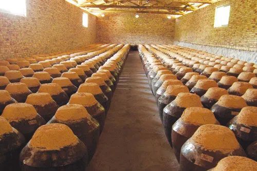 其次是蒸饭。蒸饭的目的是使淀粉糊化。要求蒸过的米饭外硬内软、内无生心、疏松不糊、透而不烂、均匀一致。再次是装缸发酵。蒸熟的米饭进行摊凉,再加水、麦曲、酒母,混合均匀,温度控制在24℃~26℃。随后装到缸里10-12小时温度升高,进人主发酵阶段。这时必须控制发酵温度在30℃-31℃,搅拌发酵,酵母呼吸和排除二氧化碳。主发酵一般要3 - 5天完成。