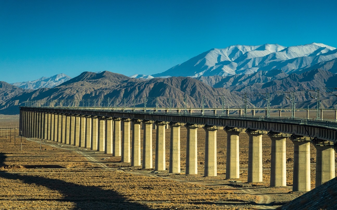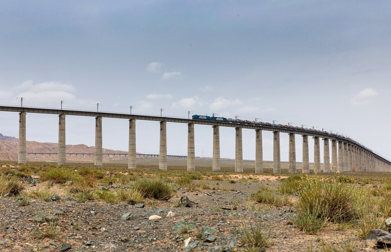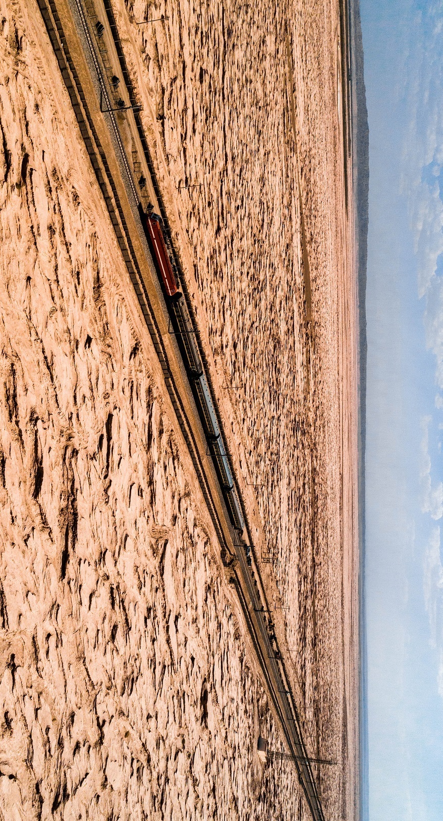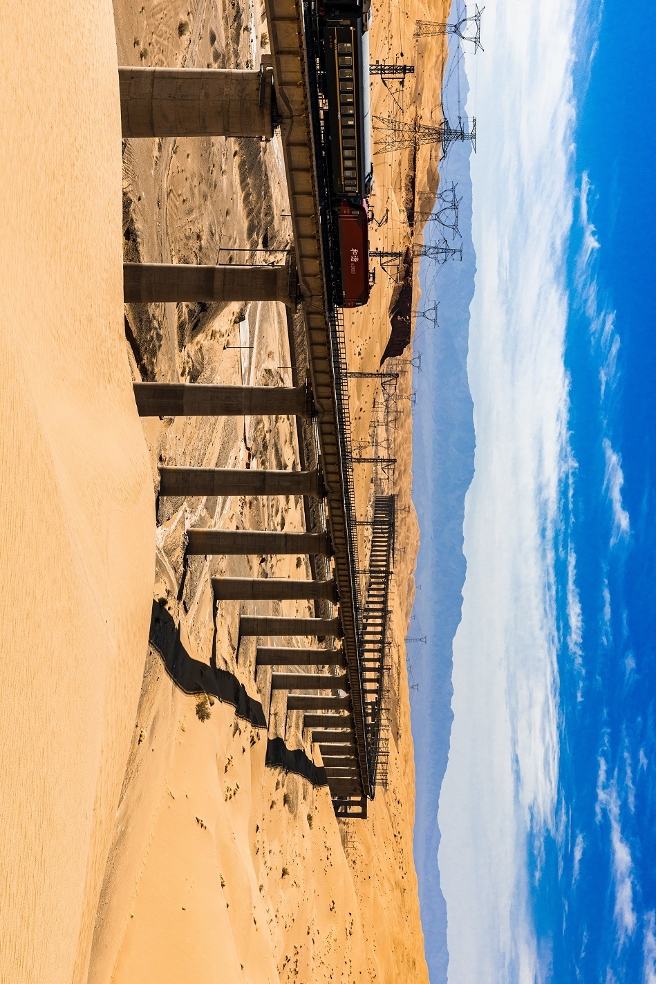 面对十里流沙,铁路建设者巧妙利用支梁桥来避免风沙对铁路的侵害。全长10.6千米,320多个桥墩架设起来的沙山沟特大桥完美地将工程景观和结构功能结合。
