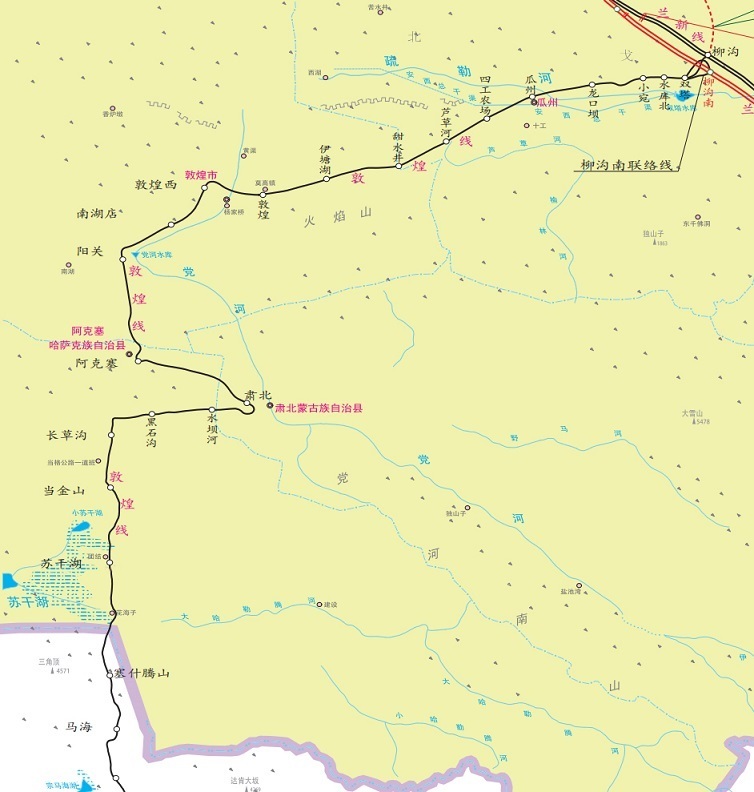 敦煌铁路,位于甘肃省酒泉市和青海省海西蒙古族藏族自治州境内,北起兰新铁路柳沟站,经敦煌、阿克塞、肃北,穿越祁连山脉进入青海省,沿马海、大柴旦,引入青藏铁路西格段饮马峡站,线路全长671公里。