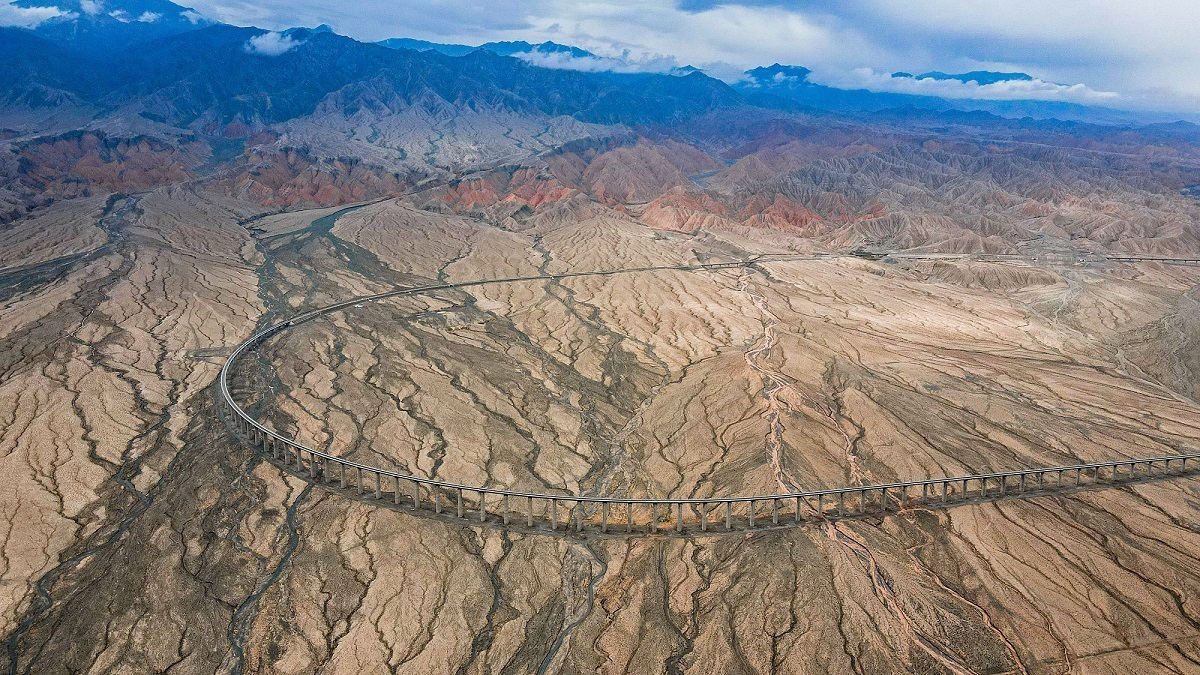 当列车驶出沙山沟,沿途海拔不断攀升,此时线路需要穿越祁连山与阿尔金山交界——当金山。这里山势陡峻,纵横沟谷切割剧烈,沟谷两侧自然山坡坡度在30°~60°之间。为了延展坡度,设计师巧妙利用支梁桥来减缓坡度。