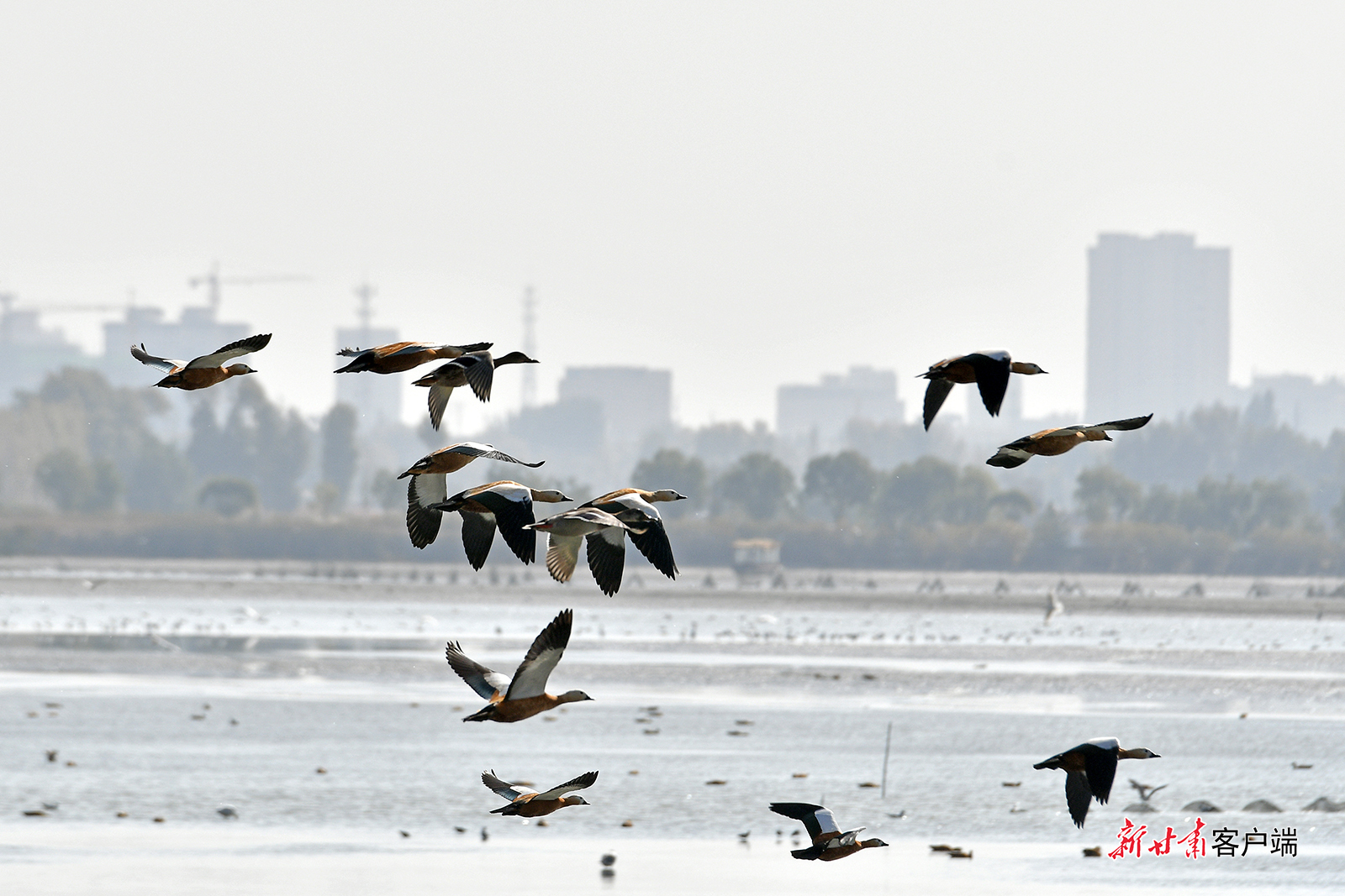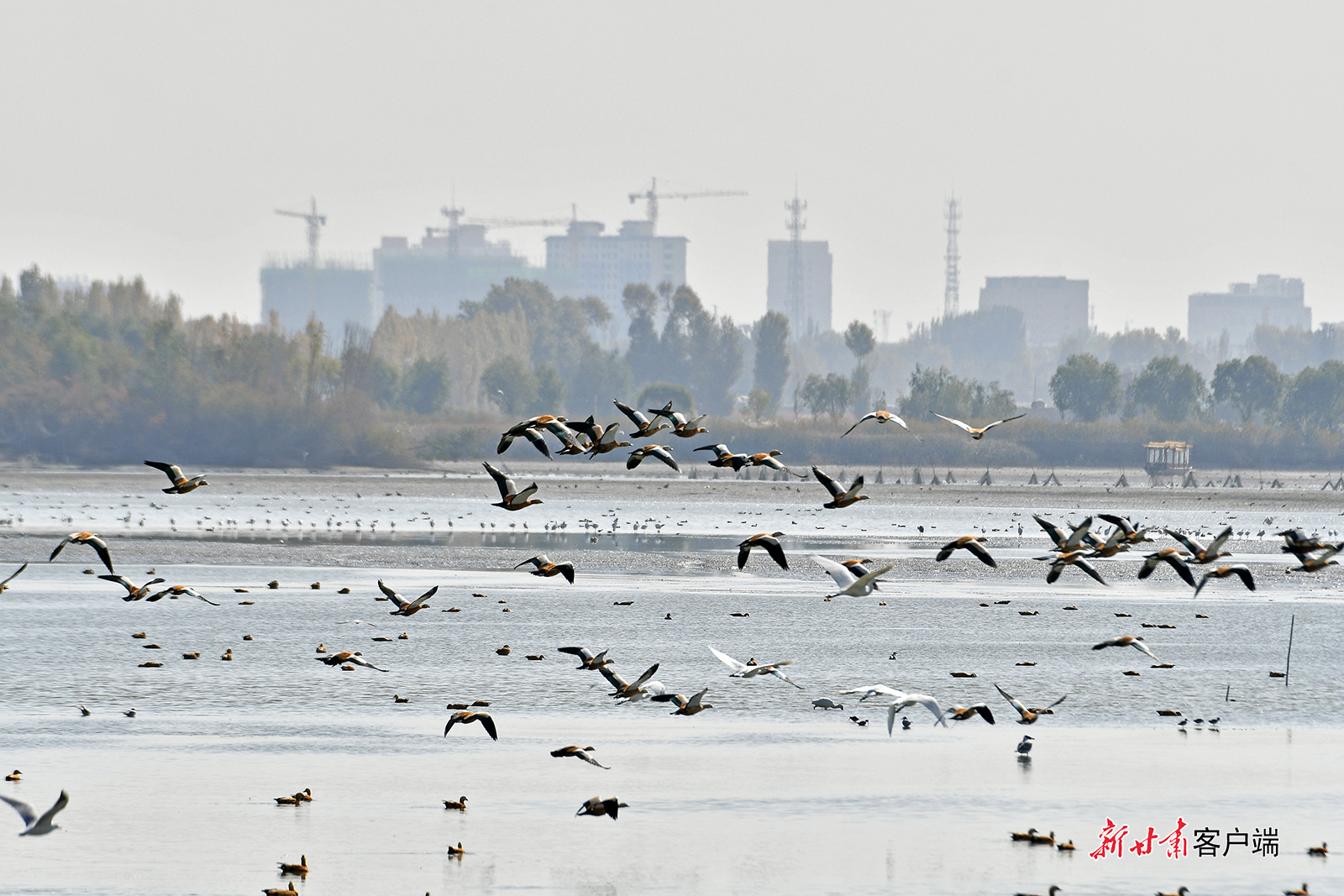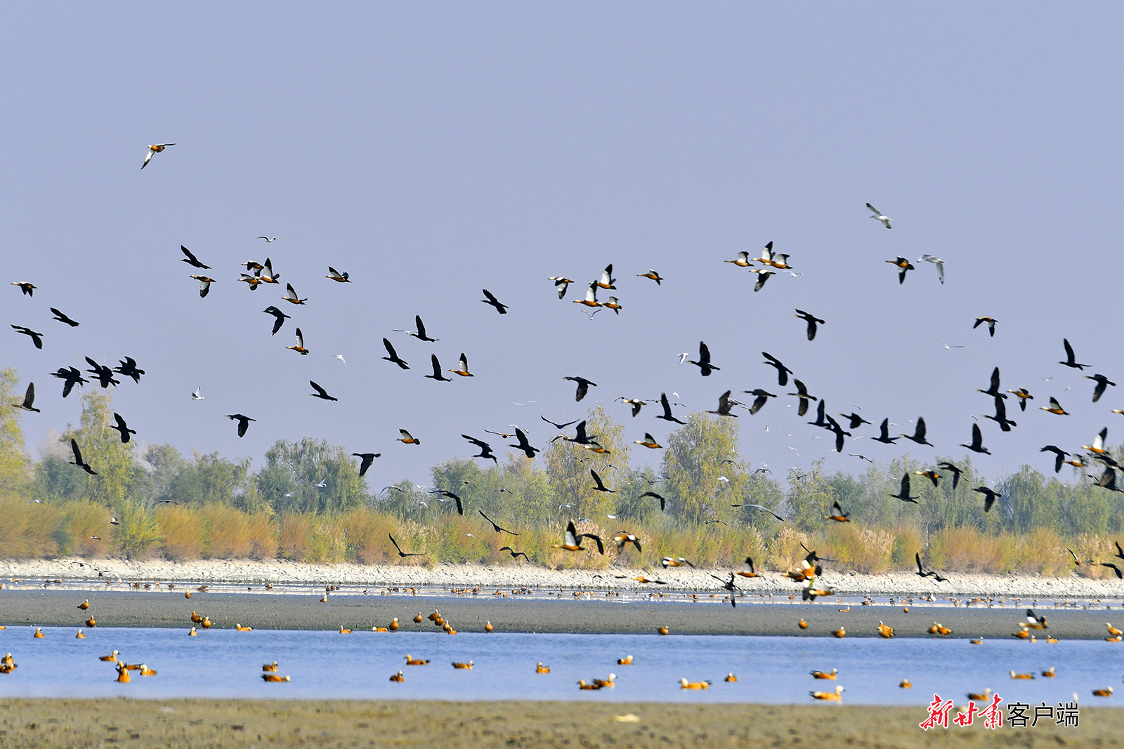 10月17日,在黑河湿地国家级自然保护区大湖湾景区,数以万计的候鸟在湿地内时而停歇觅食,时而翩翩起舞,时而漫步滩涂,构成了一幅“候鸟天堂”的美丽画卷。