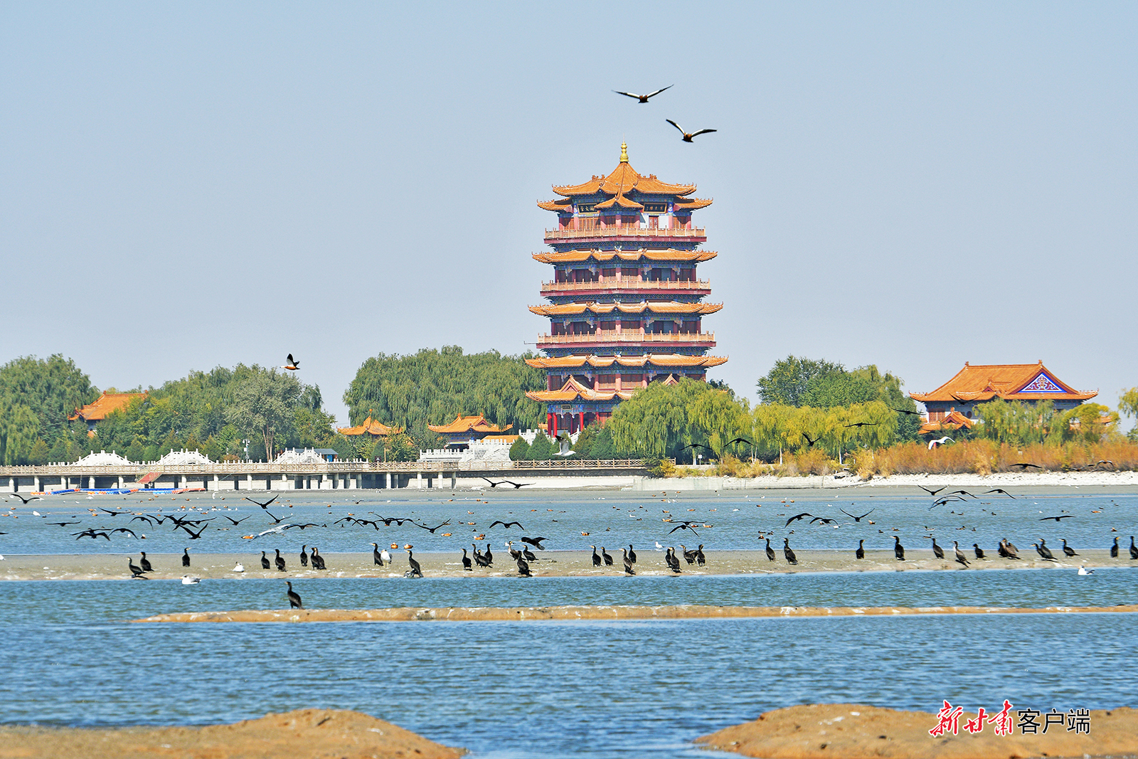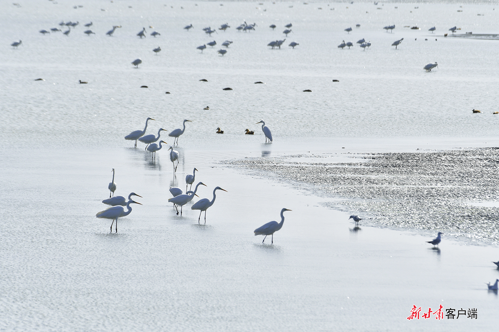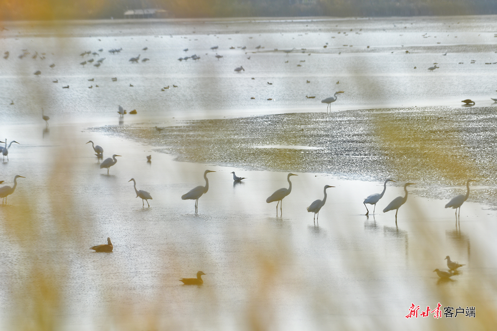 10月17日,在黑河湿地国家级自然保护区大湖湾景区,数以万计的候鸟在湿地内时而停歇觅食,时而翩翩起舞,时而漫步滩涂,构成了一幅“候鸟天堂”的美丽画卷。