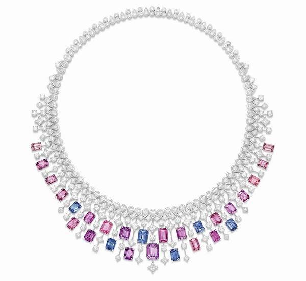 同系列高级珠宝项链和耳环以柔和的色调、多色蓝宝石的混合镶嵌以及精湛的切割工艺呈现出迷人的色彩,只有品质极为相似的蓝宝石才可以呈现出如此和谐的效果。比如朦胧暮光(Gloaming Illuminations)主题高级珠宝耳环共镶饰14颗蓝宝石,呈现如同瀑布般的流动之感。同系列高级珠宝戒指中央镶饰一颗重达6.53克拉的粉色蓝宝石,和谐色调与明亮色泽闪耀着熠熠光芒。