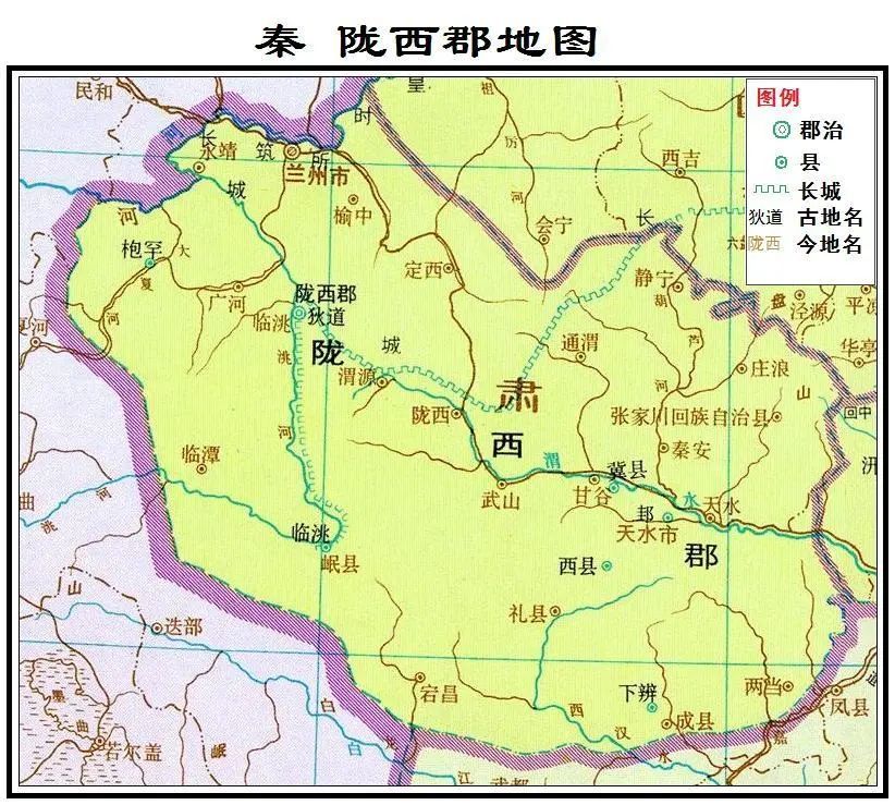据《后汉书·西羌传》记载,周赧王四十三年(前272年),秦灭义渠国,于其地置陇西郡、北地郡二郡。陇西郡,因在陇山(六盘山南段别称,为渭河平原和陇西高原之分界)以西而得名。郡治在狄道(今甘肃省临洮县南)。