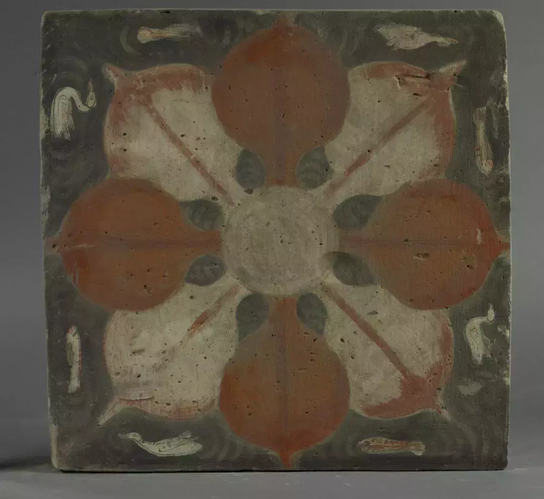 一级文物,1995年出土于敦煌佛爷庙湾39号墓。长38.5厘米、宽38.7厘米、高6.3厘米。此莲花砖是39号墓藻井,画面正中绘莲蓬,对称外延出八瓣莲叶。莲瓣尖端外围空隙处绘有凫、鱼等。藻井莲花色彩艳丽,画砖底涂黑色,莲瓣红白相间,凫、鱼墨线勾勒轮廓,内中施红白两彩,效果对比强烈。莲花系佛教的代表图像,西晋墓葬中出现莲花藻井,表明了佛教在东渐过程中对本土文化的影响。