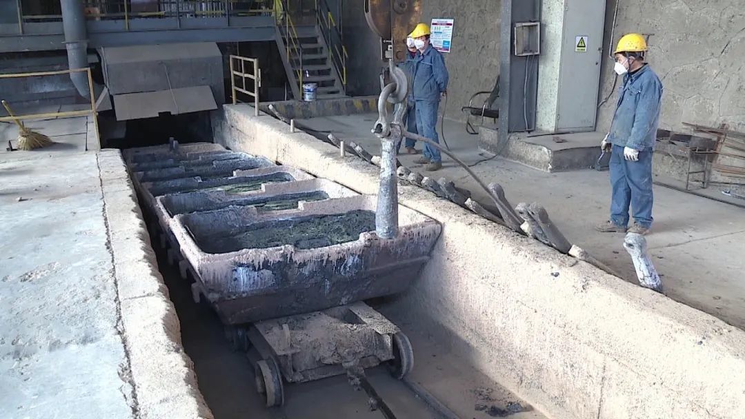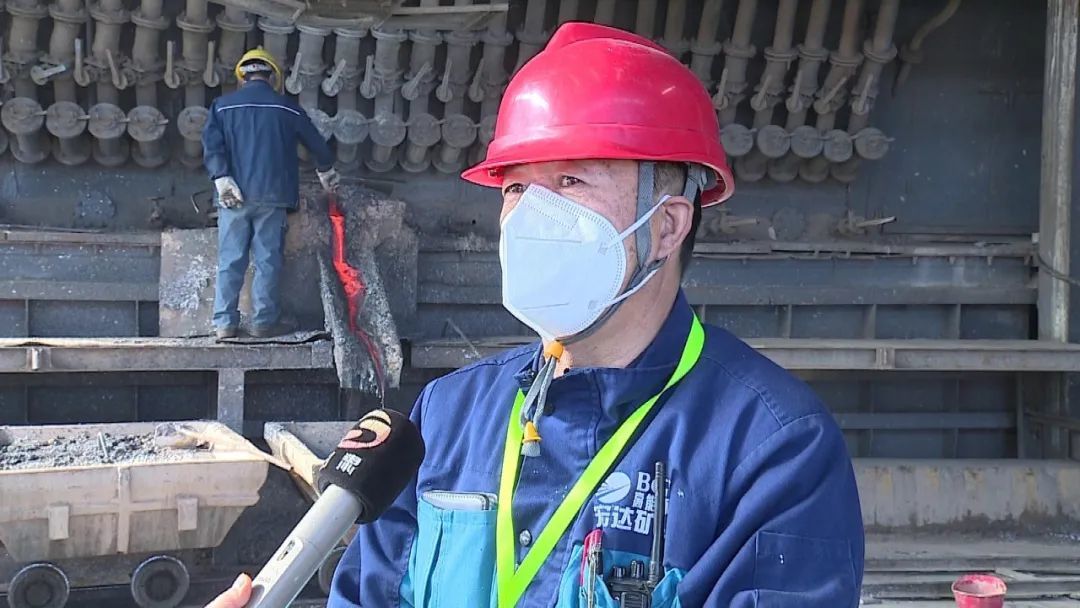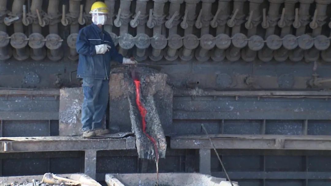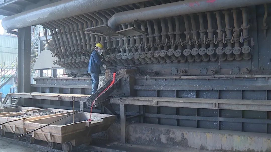 记者边文莹说:“我现在是在靖远高能的冶炼废渣的一期生产线上,在我身后的这个炉子就是一期生产线上的侧吹冶炼还原炉。在这个炉子里面,经过1000多度高温的氧化还原反应,现在流出来的就是粗铅,含有一定杂质的粗铅,同时还会产生因为不同密度和燃点的冰铜。”