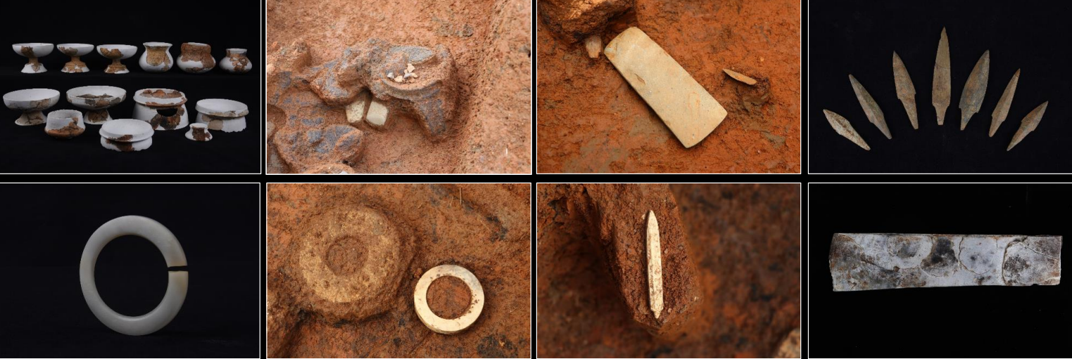 岩山寨遗址总面积约5万平方米,包含居住区、墓葬区等多个功能区。居住区发现大量灰坑、柱洞,也夹杂少量墓葬,居住生活和丧葬并未完全分开。墓葬区共发掘墓葬66座,可见一次葬、二次葬和迁出葬现象,少数墓葬保存了木质葬具残痕与人骨遗存,这在岭南同类遗址中极为罕见。随葬陶器组合以鼎、盘、豆、壶、罐为主,磨制石器以镞、锛为主,玉器有琮、钺、环、玦、璧、锛、锥形器及圭形器等,以玉钺为最大宗。墓葬形制、丧葬礼俗及随葬器物组合都具有显著的石峡文化特征。墓葬表现出明显的等级分化,高等级墓葬普遍随葬玉器,其中M16随葬品超过140件,包括5件玉钺与2件玉环,M26则同时随葬有玉琮与玉钺。
