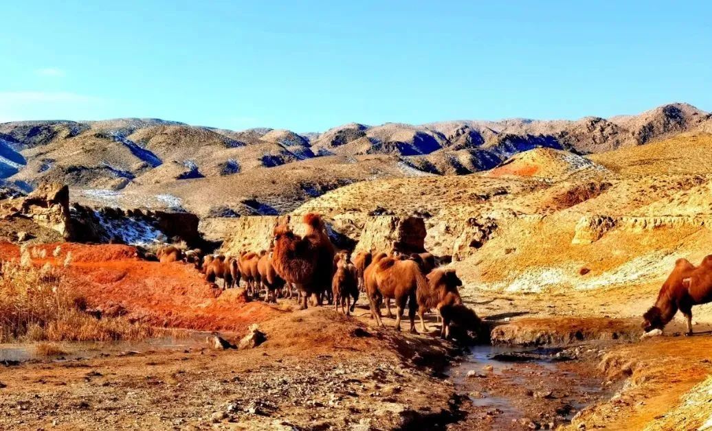 最令人兴奋不已的事情就是在泉沟水源地沿线附近偶尔会有大批骆驼群,它们会选择在游人稀少的时候,蜂拥而至,快步奔向水源地,一起饮水,场面十分壮观。
