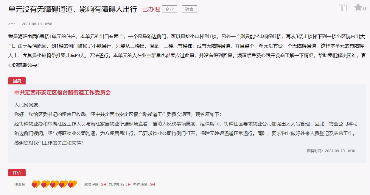 网上听民意,网下解民忧。今年来,人民网“领导留言板”(安定区专板)共收到网民留言99条,领导干部通过这一平台回应群众诉求和意见建议97期,回复率98%。同时收到市上转办网民向省委书记留言43条、向市委书记留言49条,办理并上报结果92条,回复率100%,网上留言处理及时得当,回复量较高……一项项数据的背后,是一个个“急难愁盼”问题的回应和解决,是广大群众与党政机关的真诚互动,也是推动党史学习教育走深走实一项重要举措。