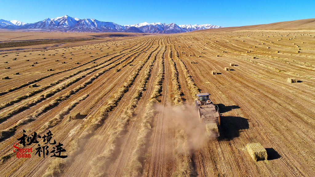 这是山丹马场的秋日燕麦草收获的场景,牧马人的生活依旧,现代化的牧草生产让自然草场得到休养生息。