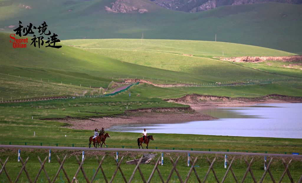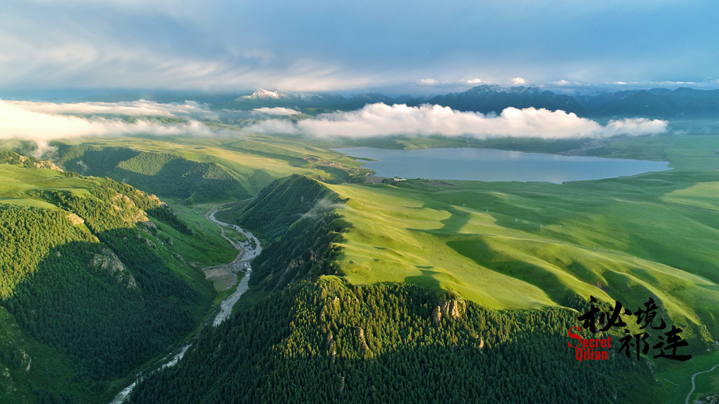这是山丹马场郁郁葱葱的夏天,鸾鸟湖如明珠一般镶嵌在草原上。