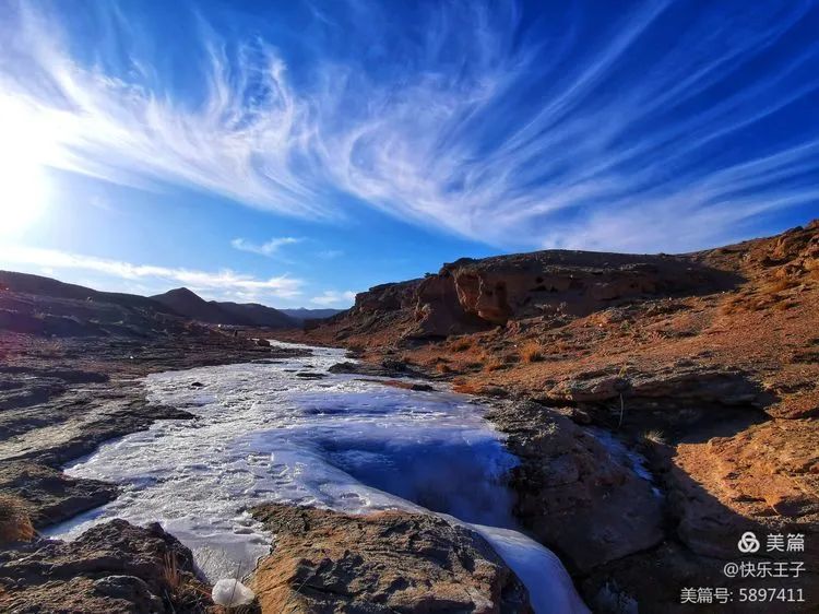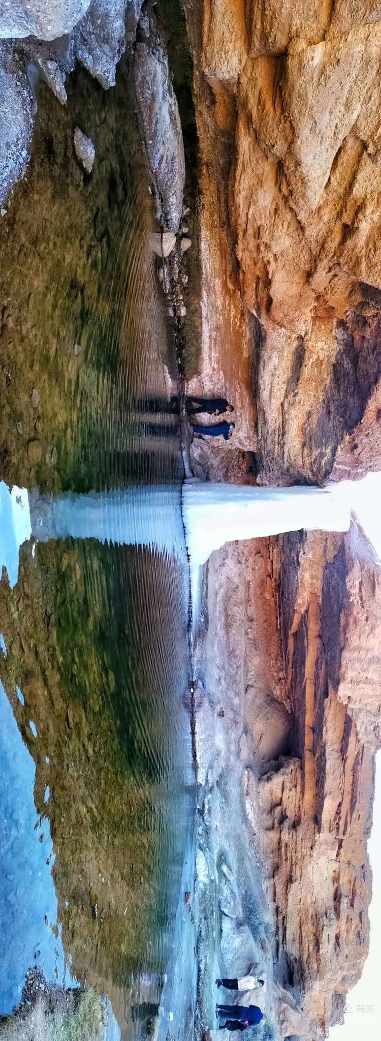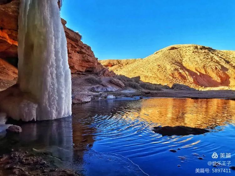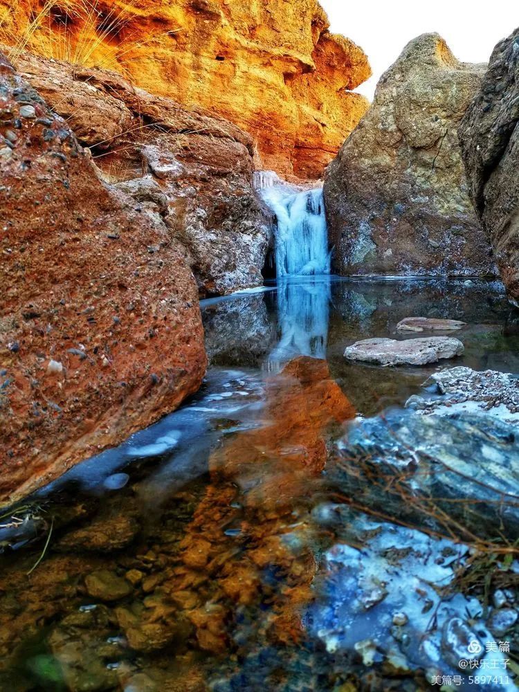 一眼泉水,喷涌而出。涓涓细流,顺沟而下,在寒冷的冬季,行成壮美的冰河和下游的梯级冰瀑,与蓝天白云和丹霞地貌遥相呼应,在镍都金昌的西北方向构成一幅炫丽的画卷。