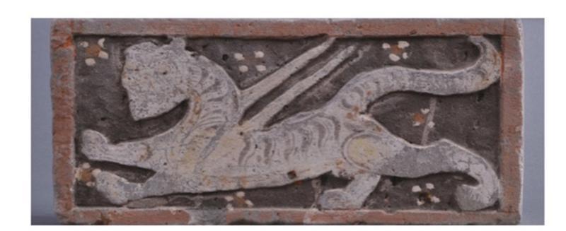 通过彩绘砖可见,这只白虎昂首,张口作怒啸状,双翼挺出,身饰虎斑纹,曲尾上扬,四肢腾跃。四周点缀四瓣白叶花,花心点桔红色。