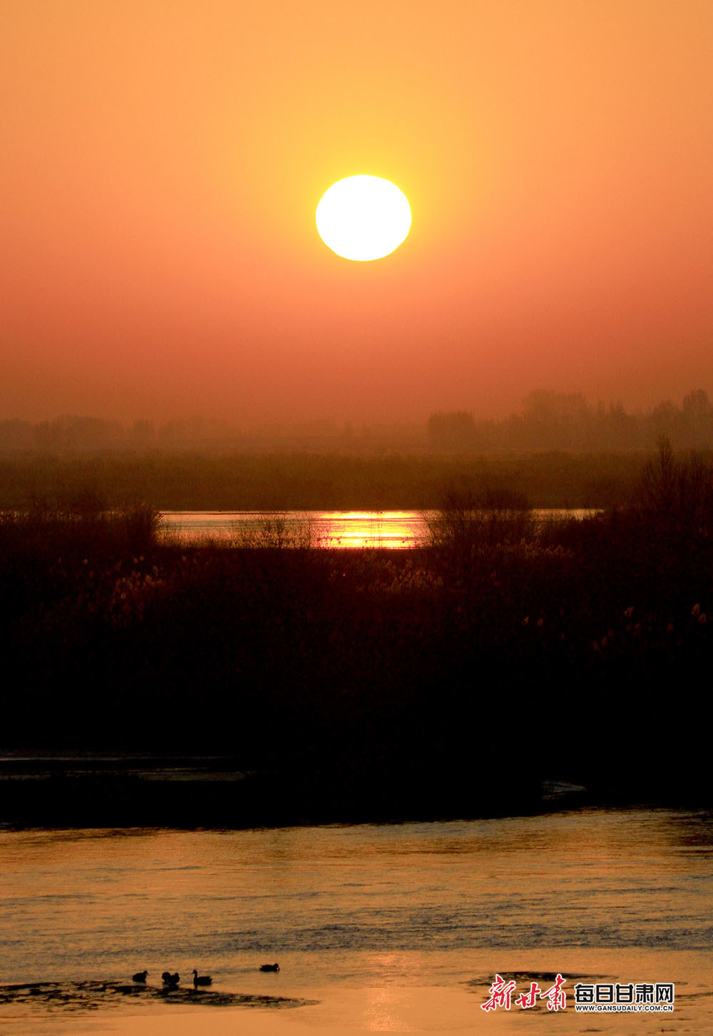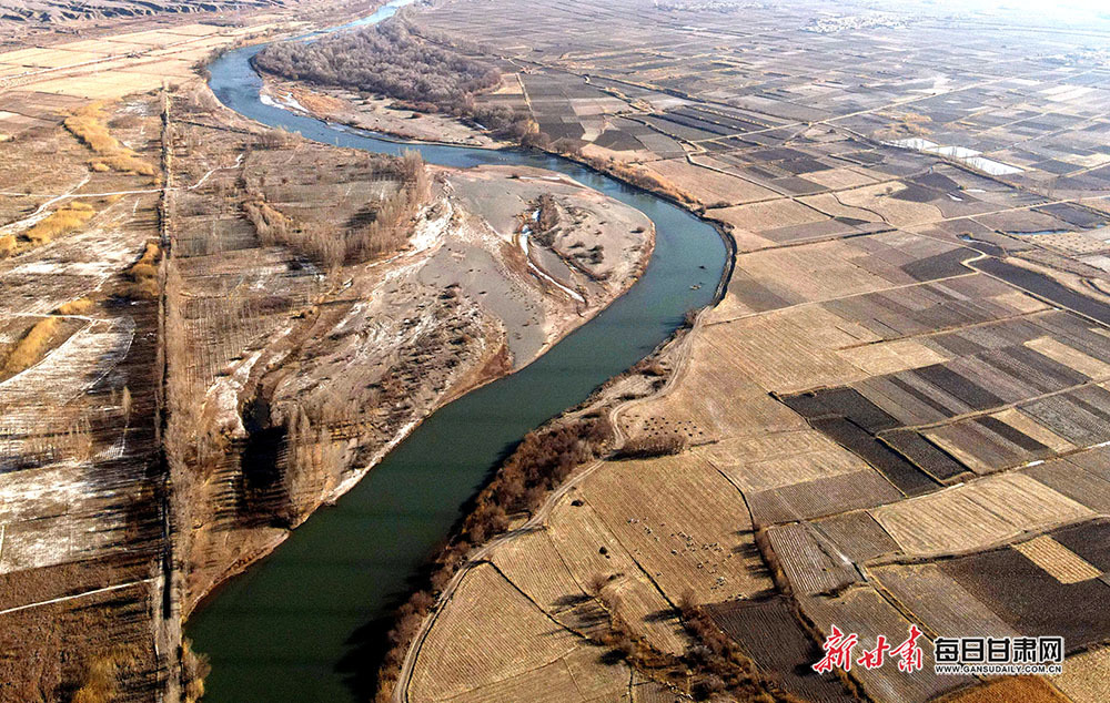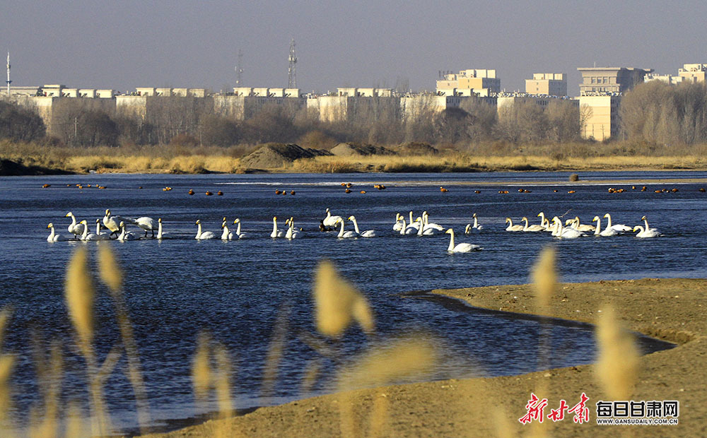 1月10日,阳光照耀在张掖市甘州区黑河两岸,农田阡陌纵横,成群的大天鹅、赤麻鸭等候鸟在黑河河道的冰面上嬉戏觅食,悠然越冬。