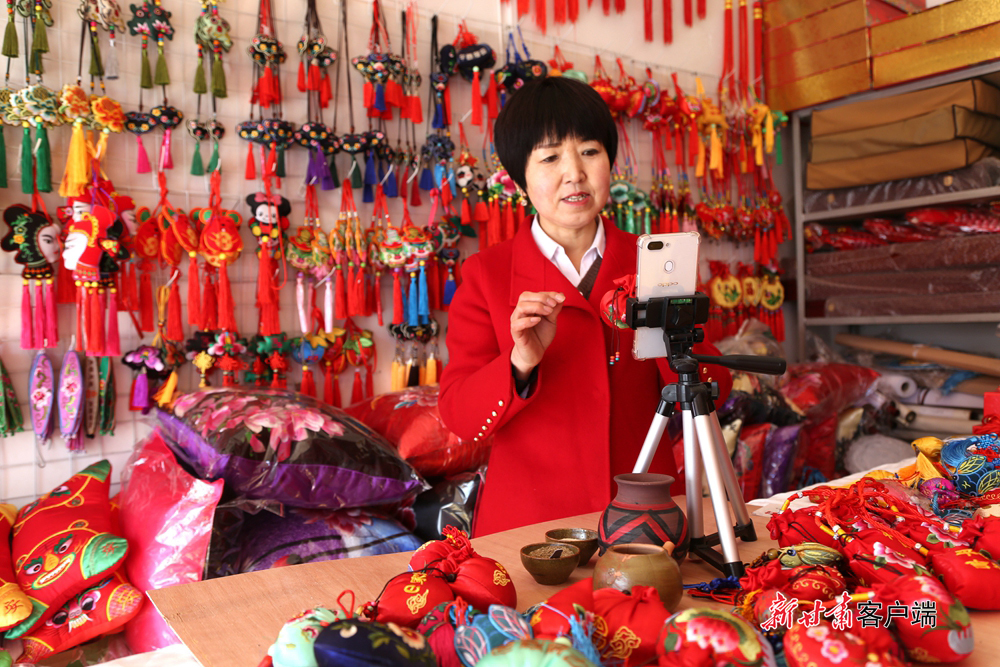 位于西峰区锦绣坊的庆阳绣韵文化传播公司的展厅里,香包刺绣传承人赵丽珺通过快手平台向粉丝介绍中药香包的制作方法和功效。新甘肃·甘肃日报通讯员 盘小美