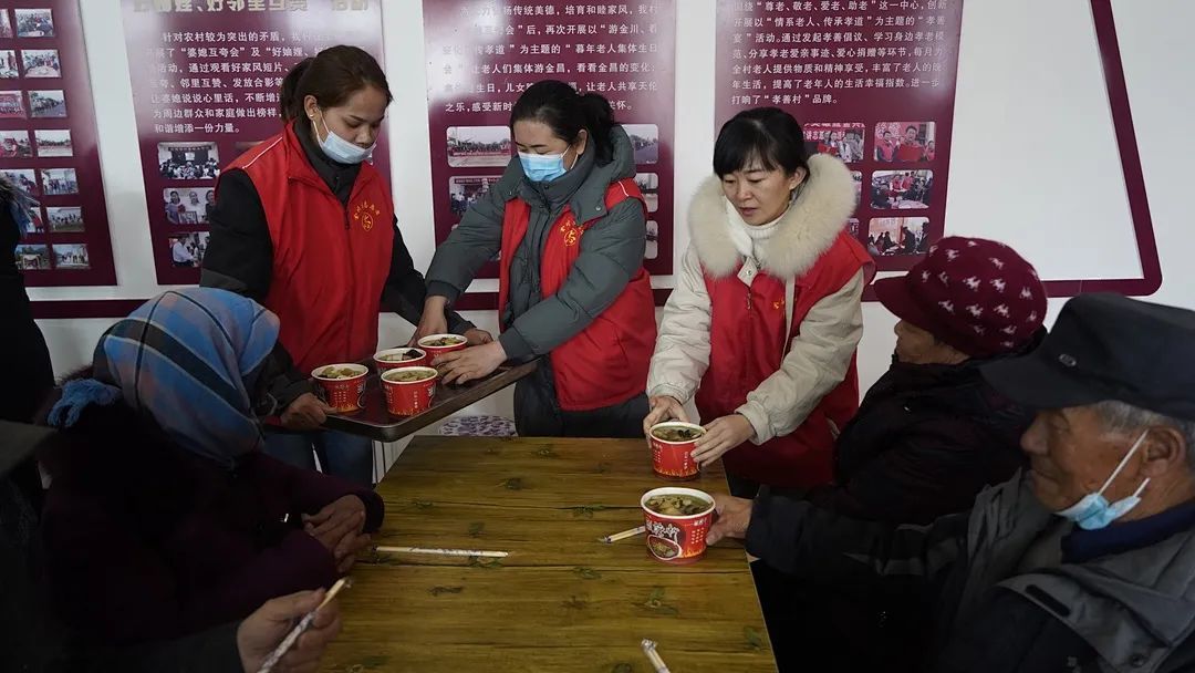 “婆媳互夸会”结束后,新粮地村为全村70岁以上老人现场发放孝善基金,子女在一旁为老人缴纳赡养费。随后,志愿者们为老人们端上了美味的烩菜和糖花、麻花,大家围坐一堂,幸福的笑容洋溢在每个人的脸上,构成了一幅其乐融融、温馨和谐的文明乡村画卷。