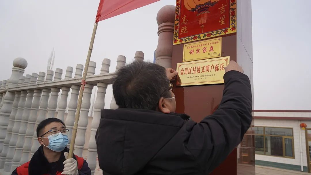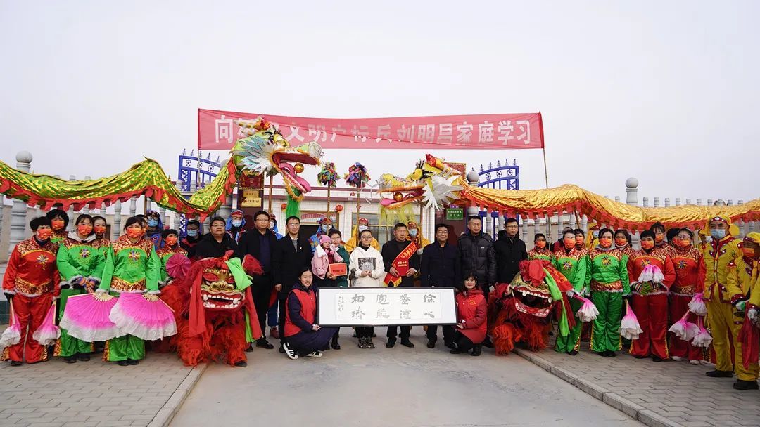 1月27日上午,伴随着喜庆的锣鼓声,金川区新时代文明实践志愿服务品牌“敲锣打鼓送荣誉”活动走进了金川区星级文明户标兵刘明昌家中,在秧歌、舞狮、舞龙齐上阵的喜庆氛围下,区政协主席王世江一行为刘明昌家庭现场颁奖挂牌、赠送家风家训书画作品。